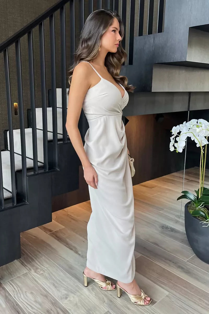 Seriously eye-catching, our Stone Strappy Wrap Top Gathered Skirt Midi Dress is a must have. Featuring adjustable straps, a V neck wrap top, a zip-up back and a midi skirt with gathering on the side and back. Dress it up with cute heels and a matching bag for the perfect occasion look.