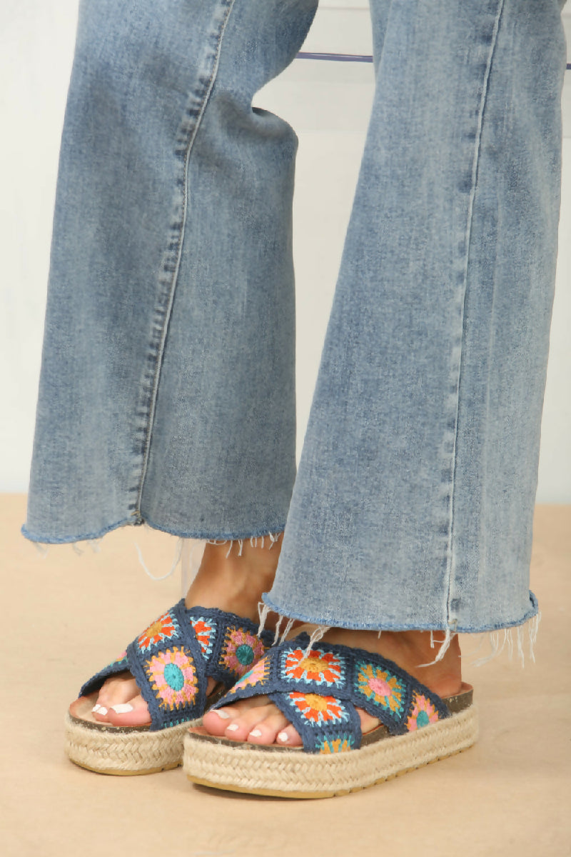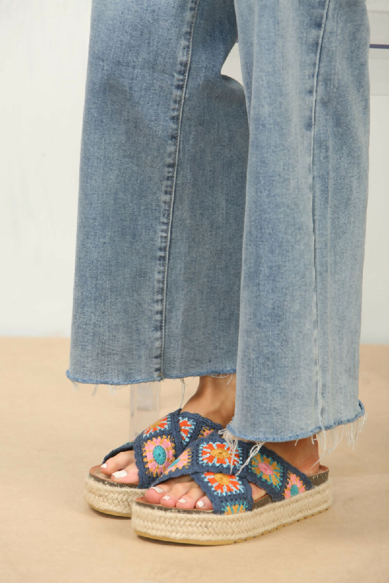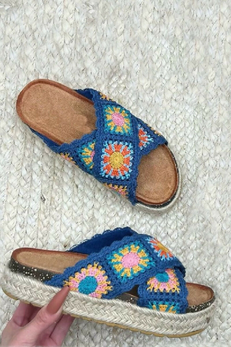 NAVY CROCHET DETAIL CROSS STRAP PRINTED SANDALS (PACK OF 12 PAIRS UK3-UK8)