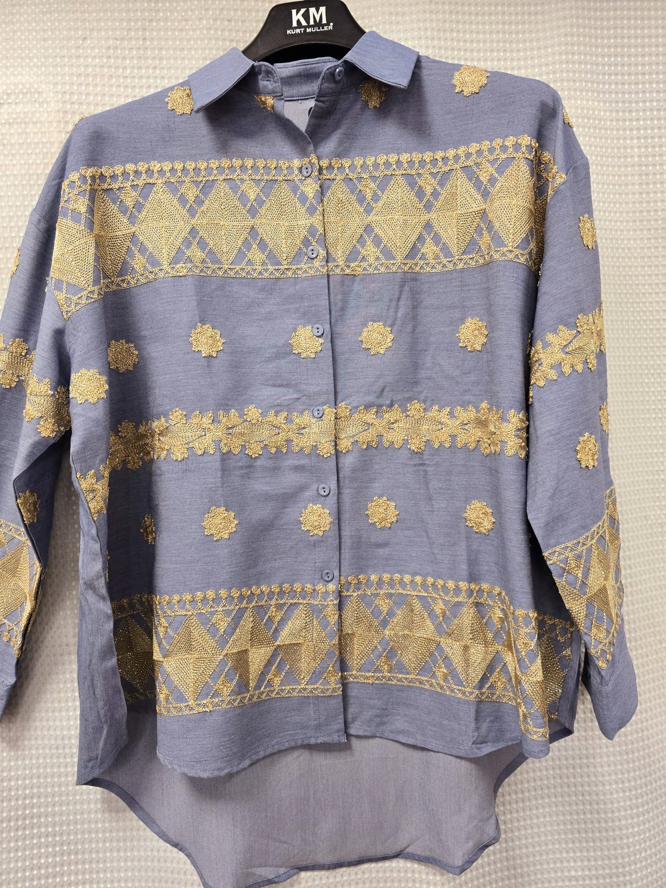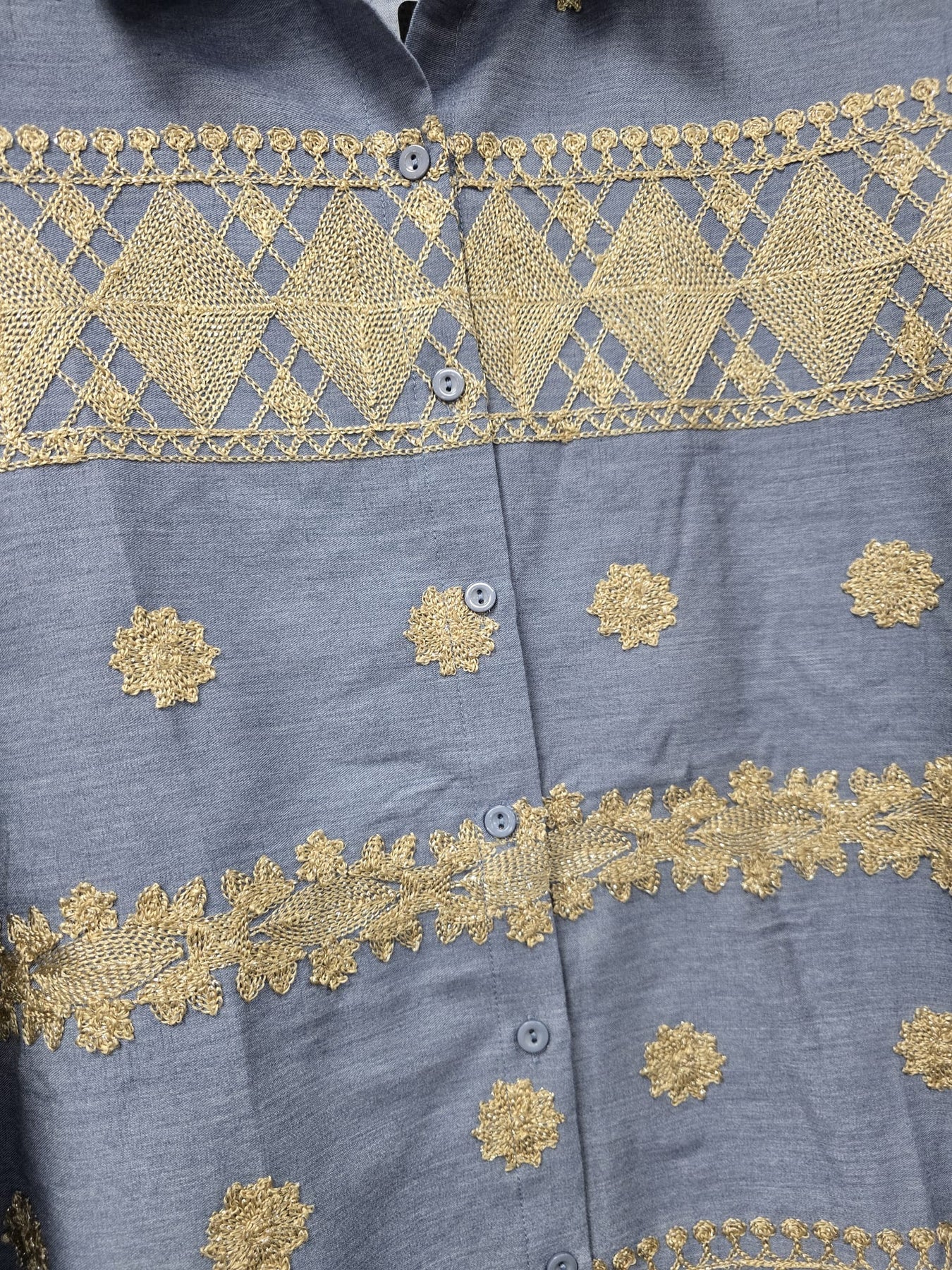 A refined gold embroidery collar shirt crafted from soft chambray cotton, perfect for effortless styling. Designed for versatility, this elegant piece can be worn open for a relaxed look or buttoned up for a more polished appearance.