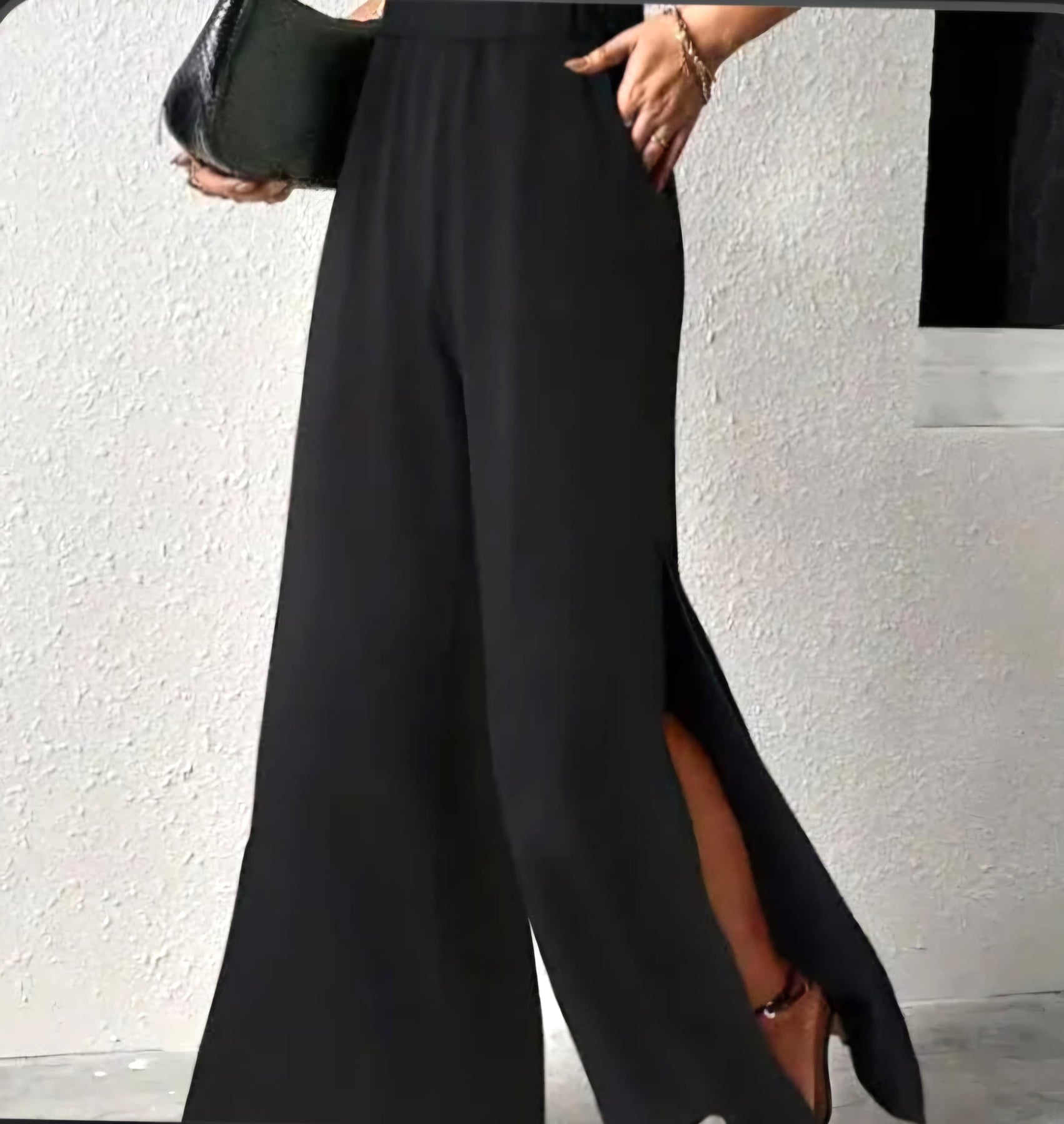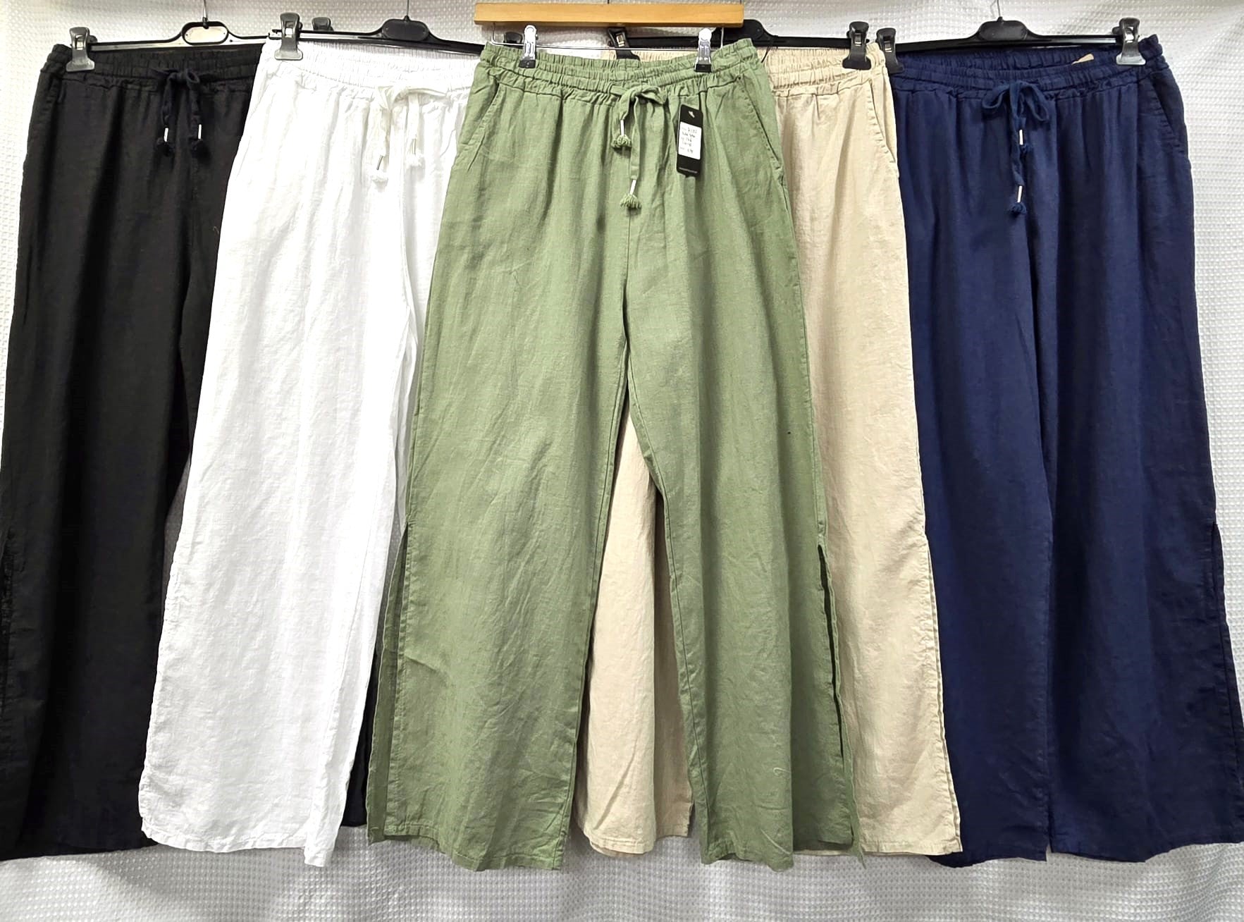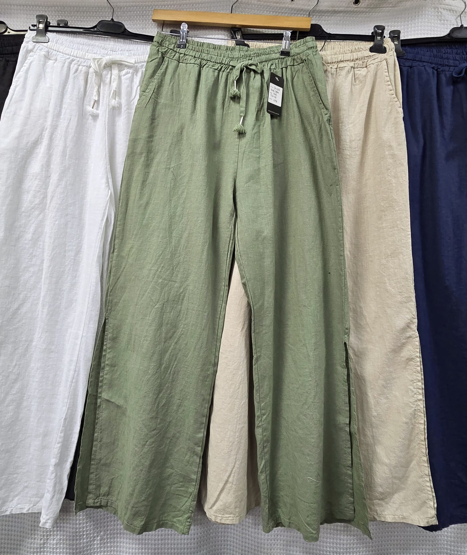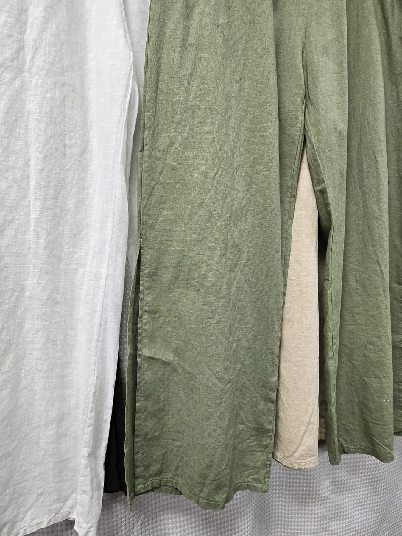 Cool, breathable wide-leg trousers in a soft linen-cotton blend. Designed with an elasticated tie waist, side splits on the hem, and two functional side pockets. Stylish and versatile – great for casual days or summer getaways.