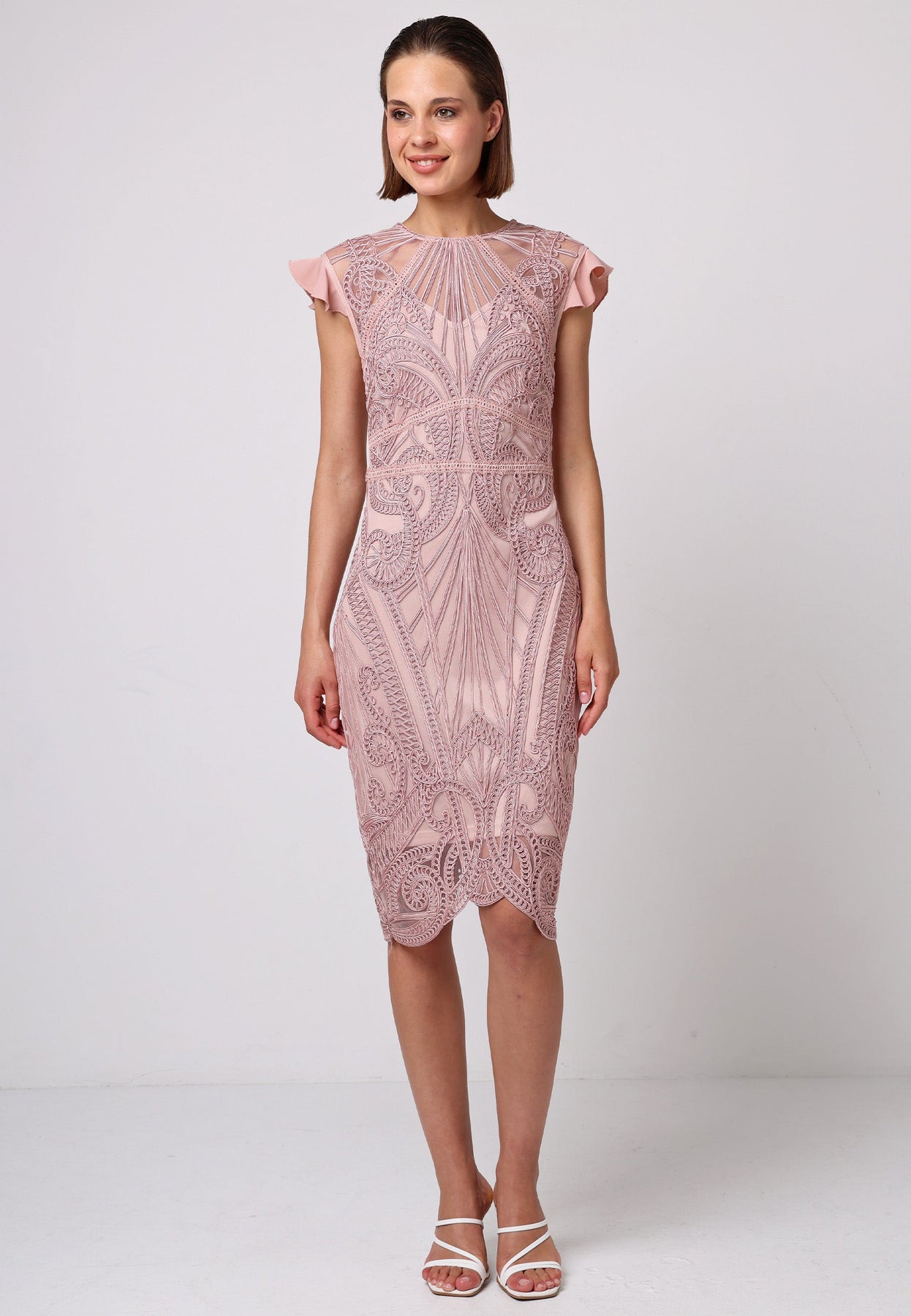Ornately detailed with lace this Bodycon Midi Dress in Rose Pink by ANGELEYE is a romantic choice! Made with a fitted lace bodice with very flattering silhouette.