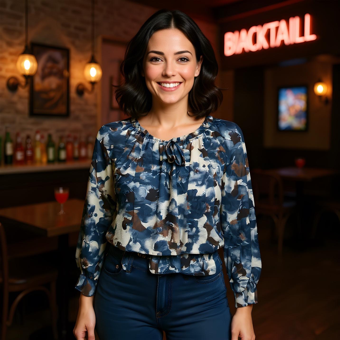 Stylish and trendy print blouse with ruffle elasticated stretch neckline which can be worn on or off the shoulder. Faux tie fastening. Long sleeves with stretch ruffle cuffs and stretch hem for relaxed fit. Fully lined.