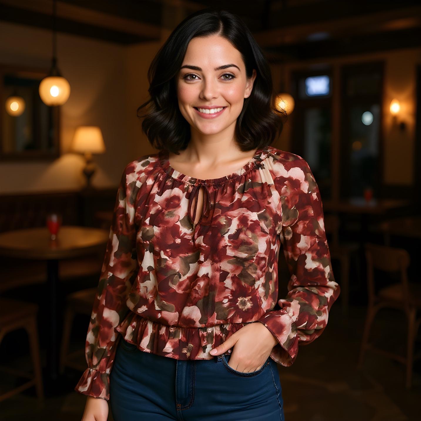 Stylish and trendy print blouse with ruffle elasticated stretch neckline which can be worn on or off the shoulder. Faux tie fastening. Long sleeves with stretch ruffle cuffs and stretch hem for relaxed fit. Fully lined.
