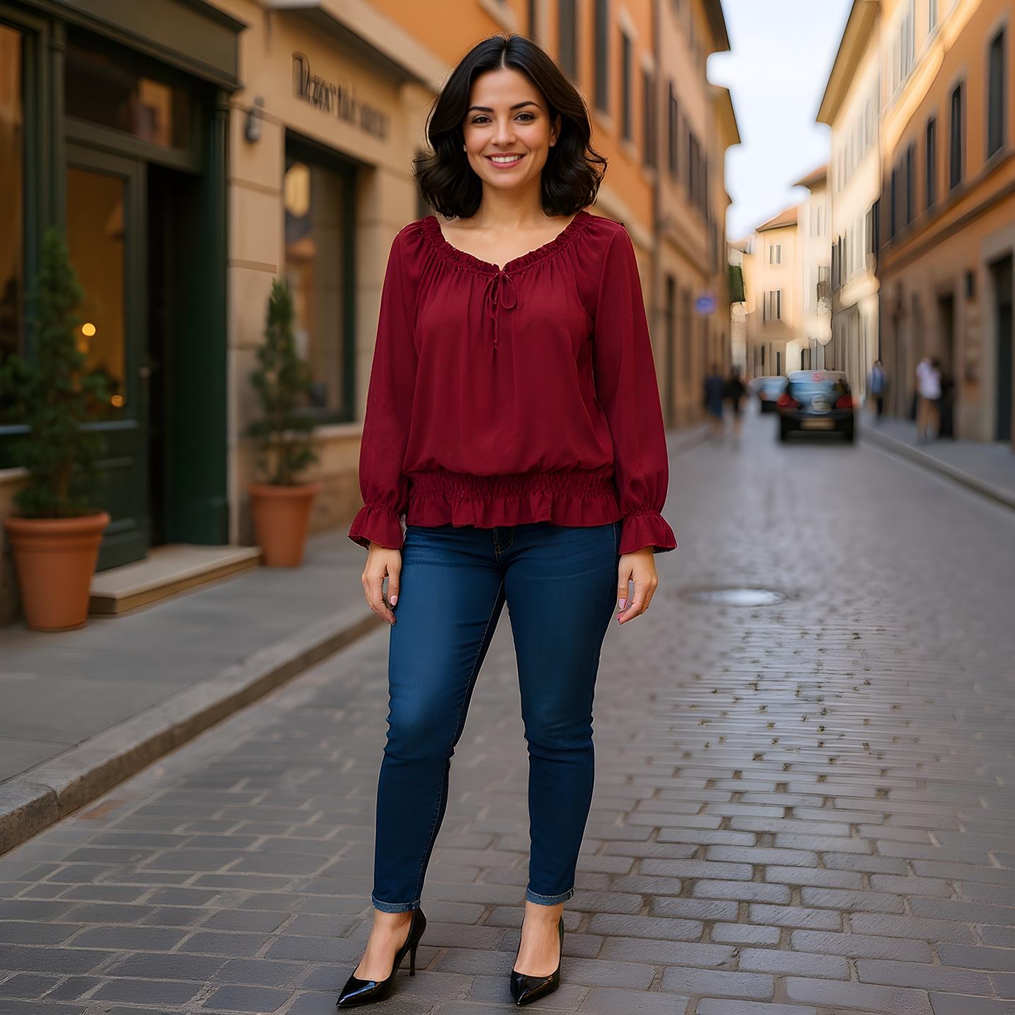 Stylish and trendy plain blouse with ruffle elasticated stretch neckline which can be worn on or off the shoulder. Faux tie fastening. Long sleeves with stretch ruffle cuffs and stretch hem for relaxed fit. Fully lined.