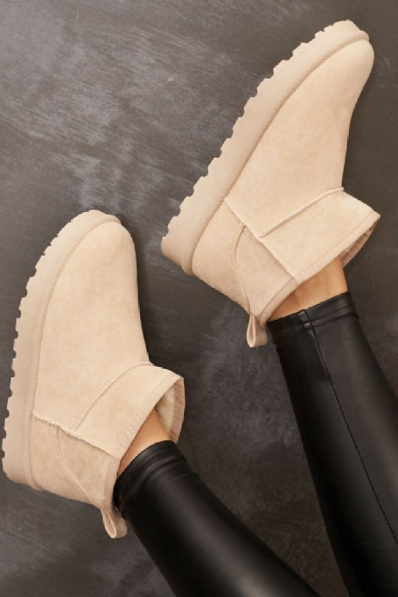 BEIGE FAUX SUEDE ULTRA MINI COZY SNOW ANKLE BOOTS (PACK OF 12 PAIRS UK3-UK8)