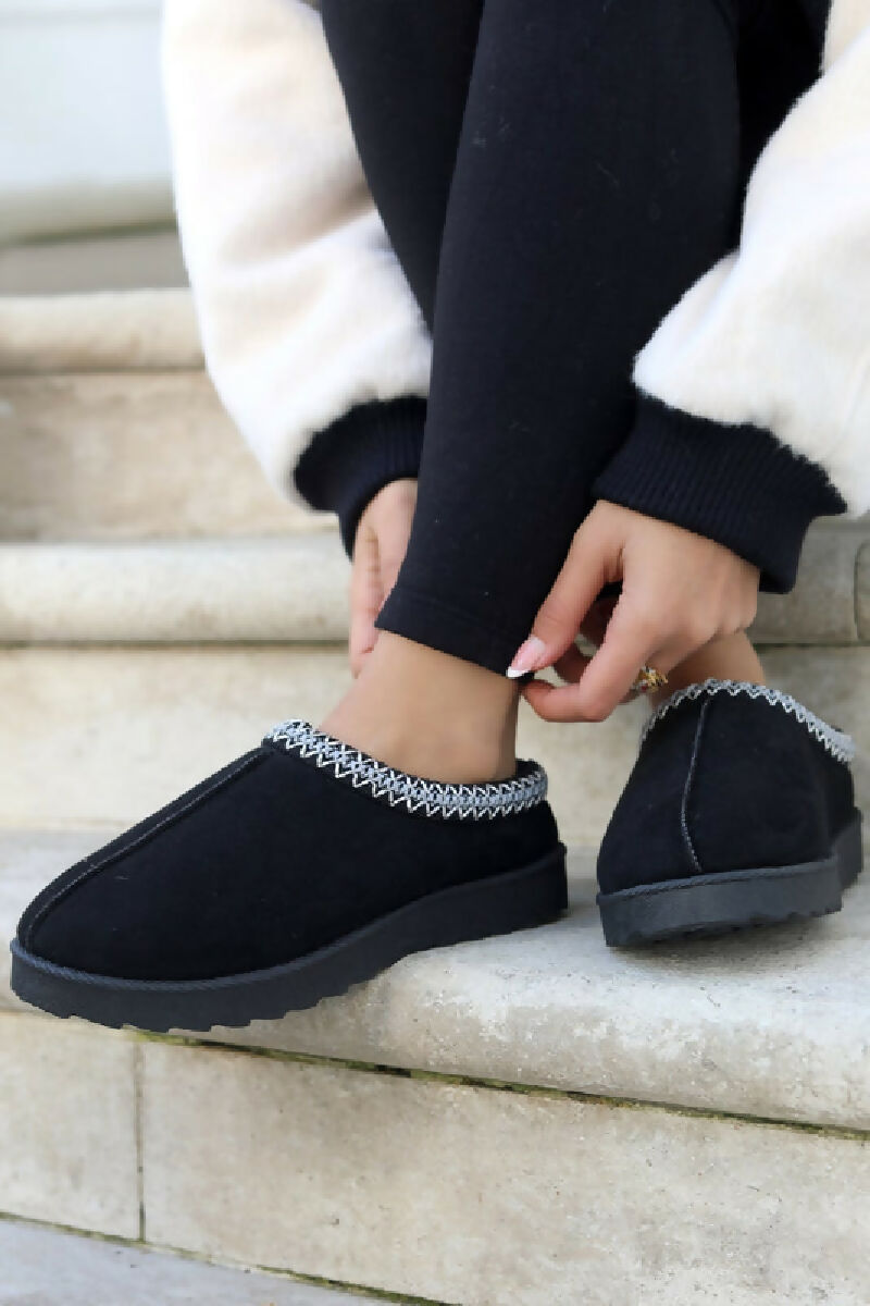 BLACK FAUX SUEDE EMBROIDED AZTEC DETAIL COZY FLUFFY SLIPPERS BOOTS BOOTIES (PACK OF 12 PAIRS UK3-UK8)