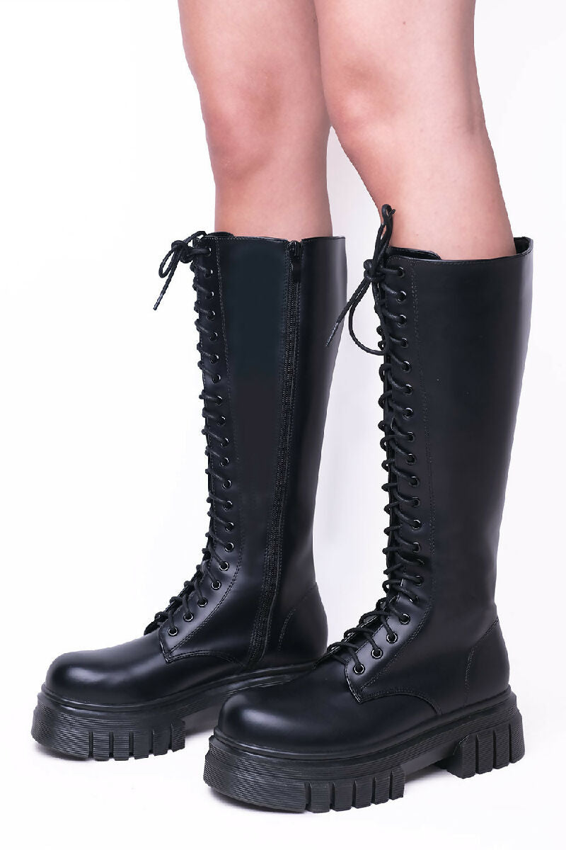 Black PU Chunky Calf High Boots With Lace Up Detail (PACK OF 12 PAIRS UK3-UK8)