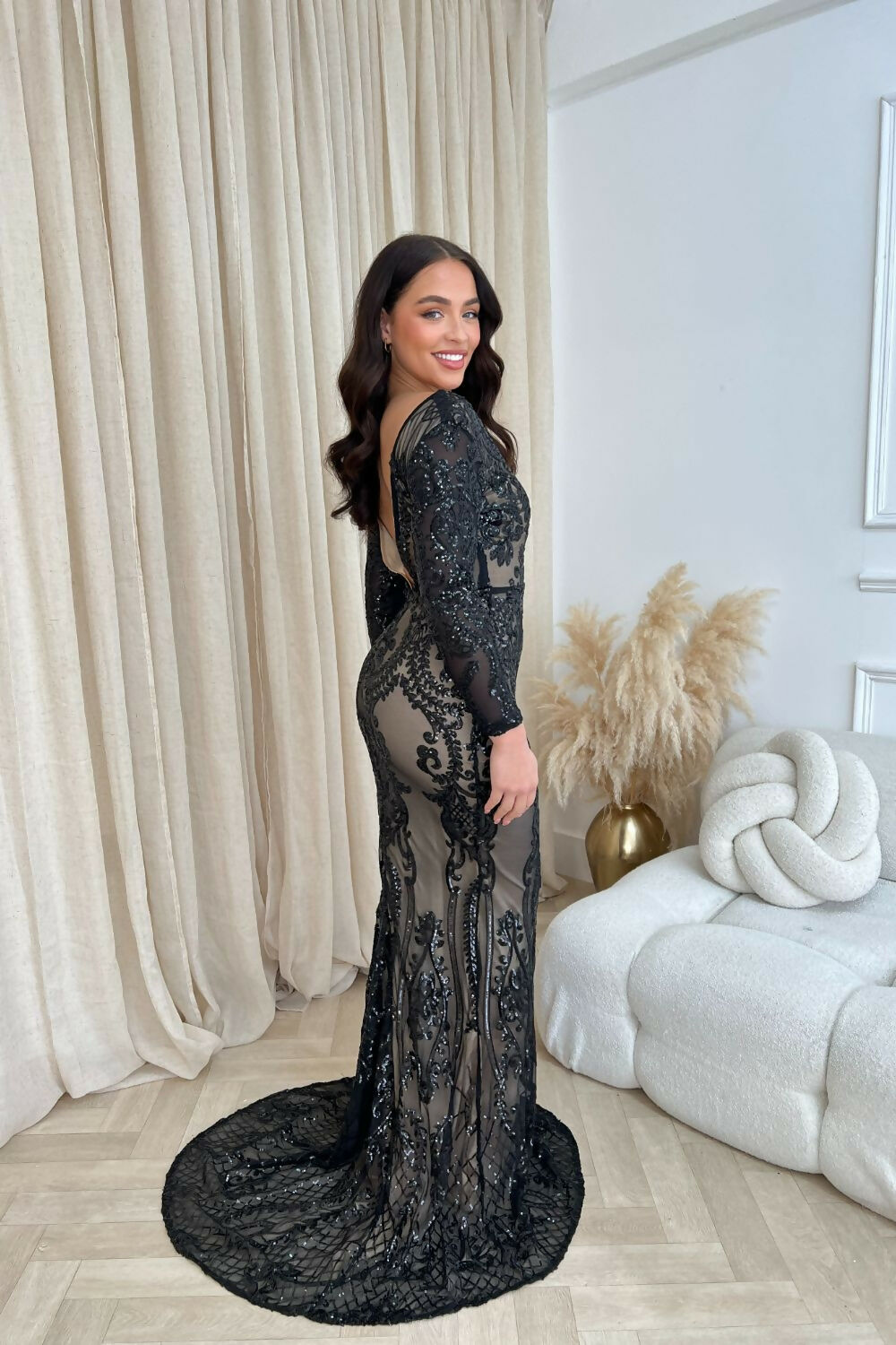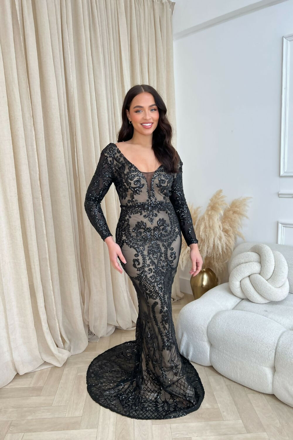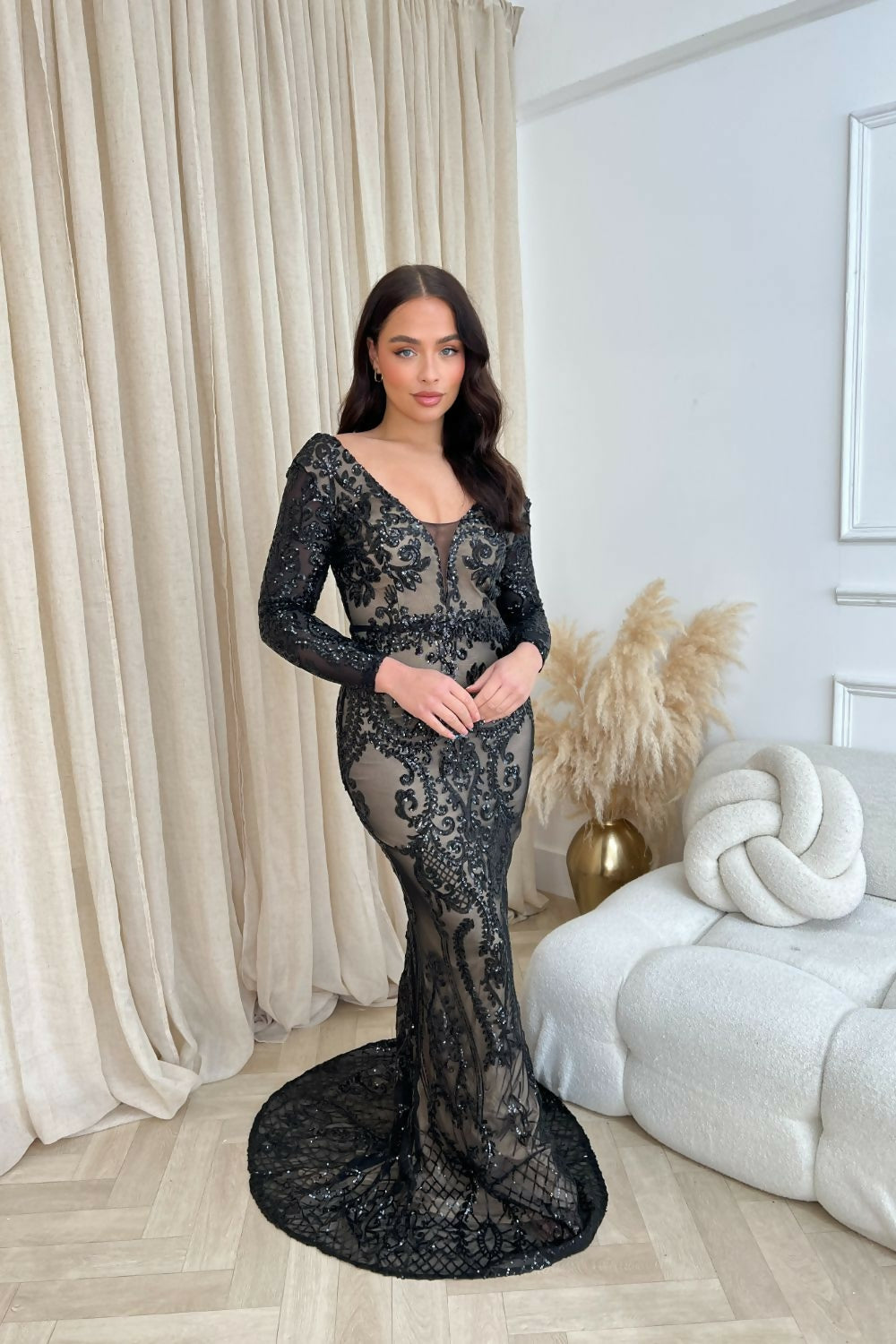 Make a lasting impression with the stunning Annabella Maxi Dress in Black Nude. This luxurious gown features intricate floral sequin embellishments and a dramatic fishtail silhouette, perfect for creating an unforgettable look at any VIP occasion.