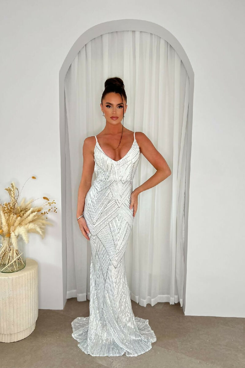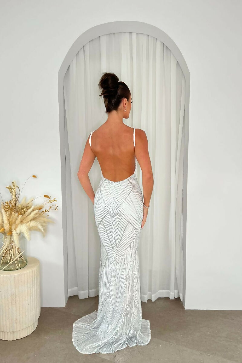 Dramatic, dazzling, and unforgettable — the Endless Silver Maxi Gown is a full-length statement piece designed to command attention. Featuring a luxe sequin-embellished mesh overlay, backless design, and a sculpted mermaid silhouette with a soft fishtail finish, this gown is the ultimate showstopper for high-end eveningwear. The symmetrical stretch fabric creates a flattering hourglass illusion while the plunging neckline and adjustable straps add elegance and comfort in equal measure.