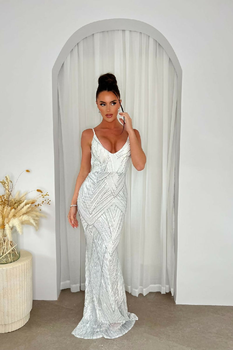 Stock the Endless Silver Maxi Dress for a premium offering that guarantees elegance, glamour, and sell-through success