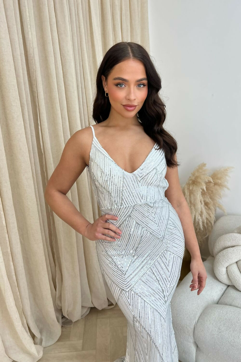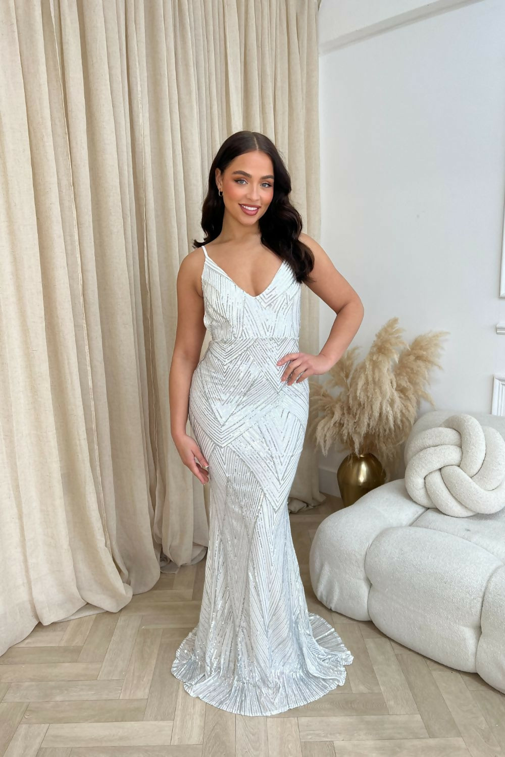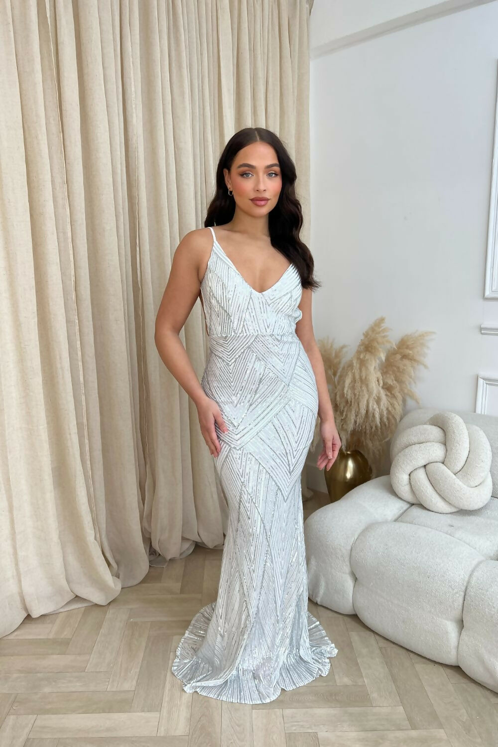 Dazzle at every event with the Endless Backless Sequin Gown in Silver. This floor-length showstopper blends timeless elegance with modern sophistication, featuring shimmering sequin embellishments and a bold backless design. The plunging V-neckline and mermaid fishtail silhouette ensure your customers make a statement at any occasion.