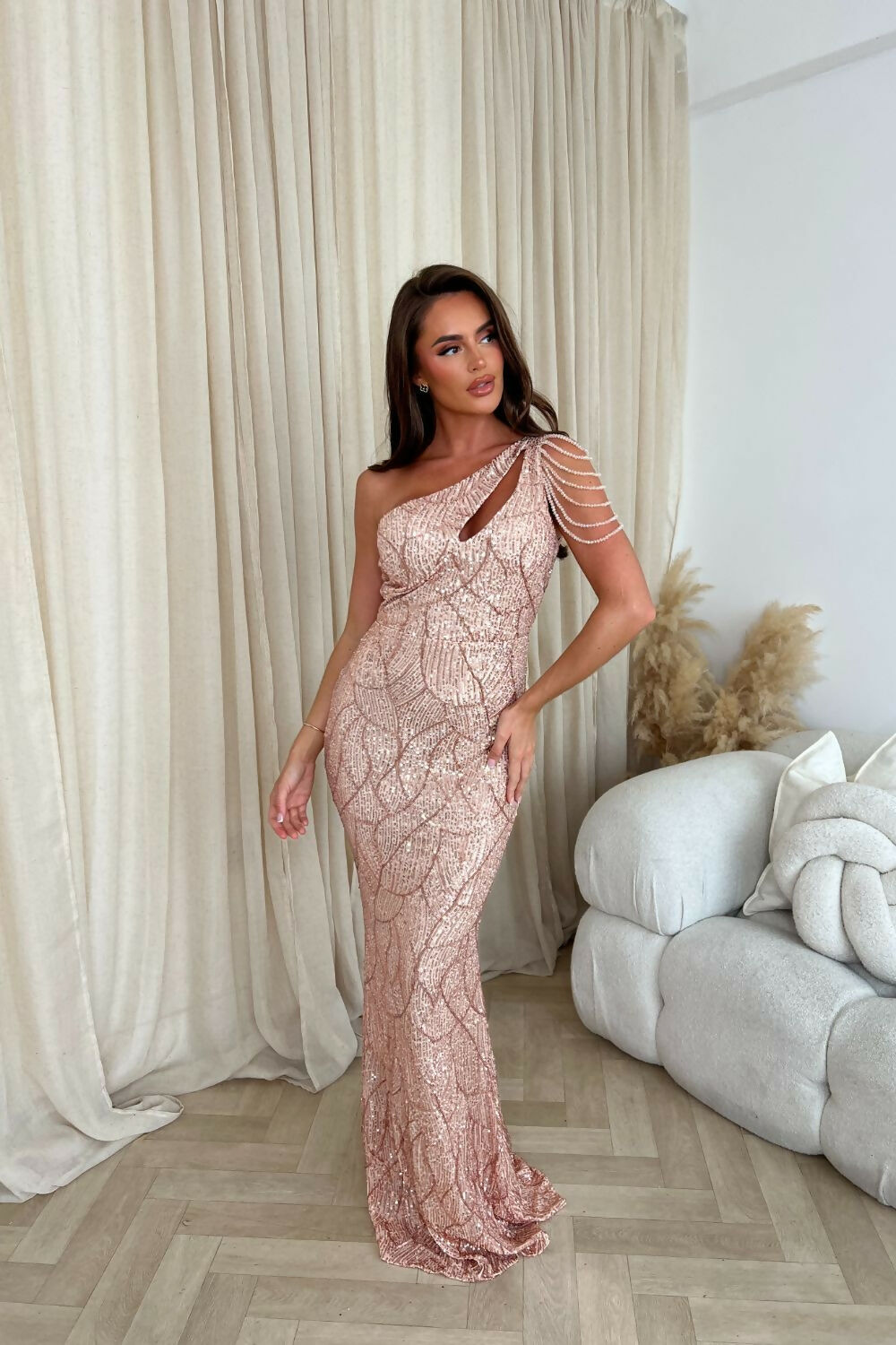Turn heads in the dazzling Impress Luxe Maxi Dress. This stunning rose gold gown combines elegance and glamour, making it perfect for your most special occasions. Designed to hug your curves in all the right places, it’s the ultimate showstopper.