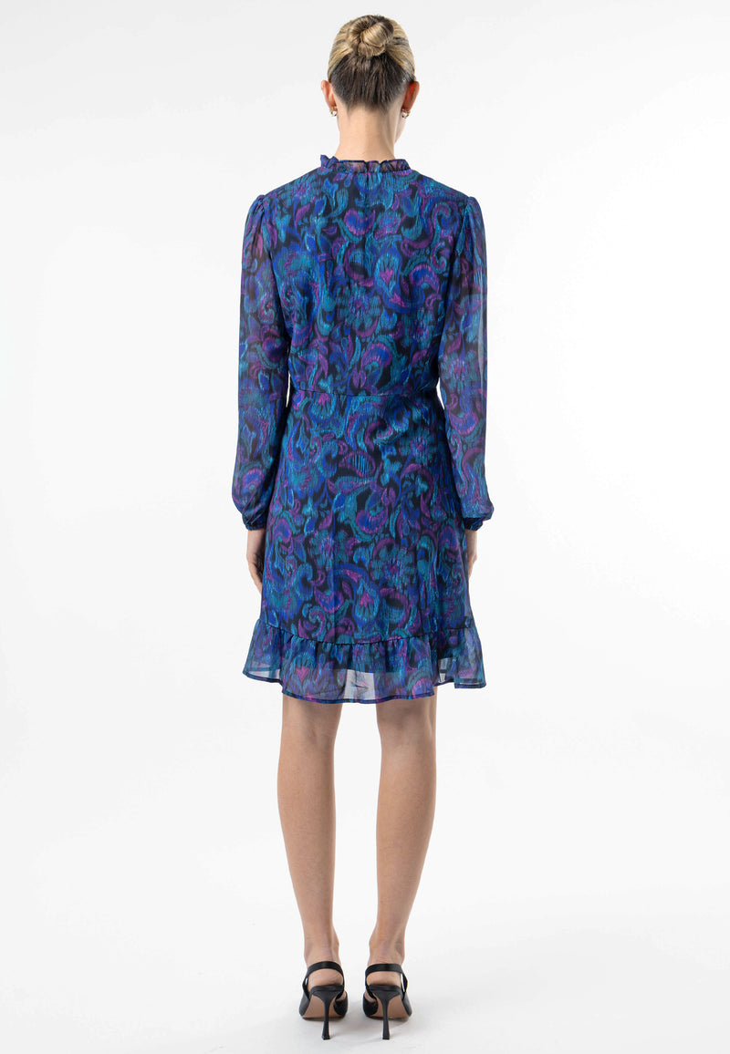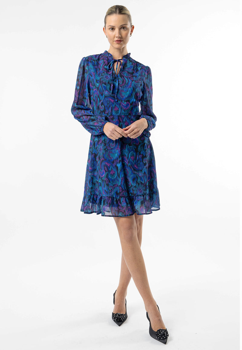 Tie Neck Chiffon Mini Dress in Blue Paisley Print