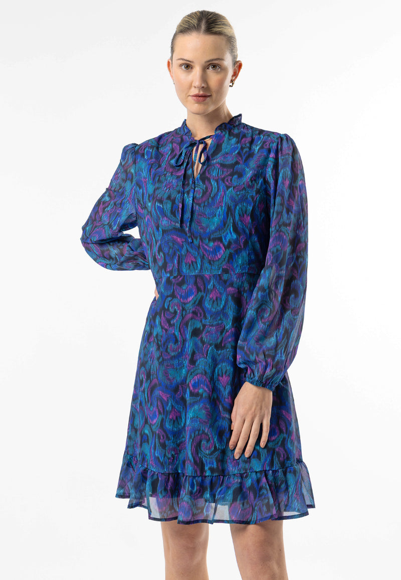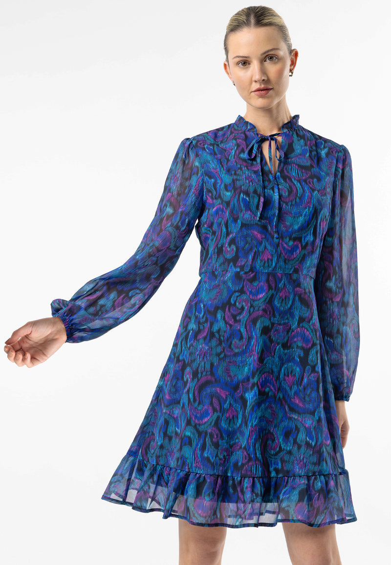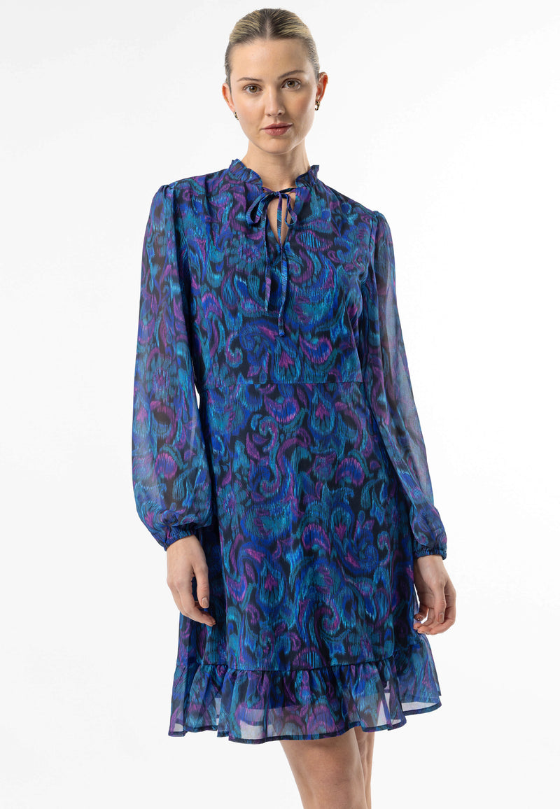 Fun and class combines in ANGELEYE's Tie Neck Chiffon Mini Dress in Blue Paisley Print. This chiffon mini with long sleeves, high neck tie detail, ruffle hem and a-line skirt will carry you through the seasons. Blues, purples and teals shine in this gorgeous boho print for a pop of colour in dull weather. Match with heels or boots to complete this look and stay cool season savvy.