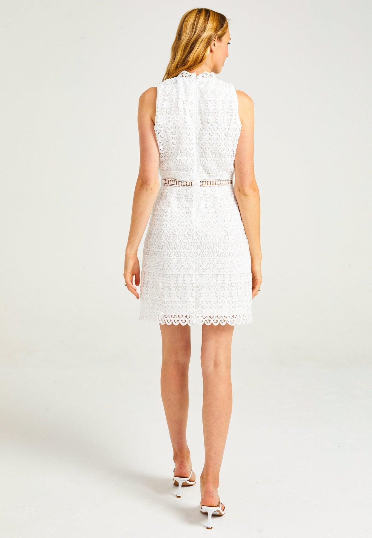 Looking for that Little White Dress for summer occasions, then this Broderie Lace Mini Shift Dress is just what you need. Features a sheer waistline detail and high scallop neck on an intricate lace fabric. Pair with heels and clutch to complete the look.
