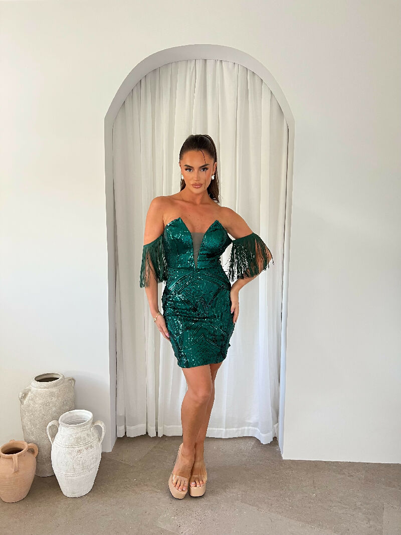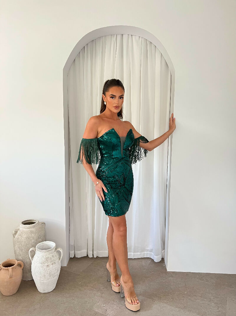 Command attention with the Yazmine Green Sequin Bardot Mini Dress – a stunning figure-sculpting style designed to shimmer with every step. This luxe illusion dress features intricate sequin embellishment, a daring plunge neckline, and dramatic tassel fringe sleeves for a glamorous edge.