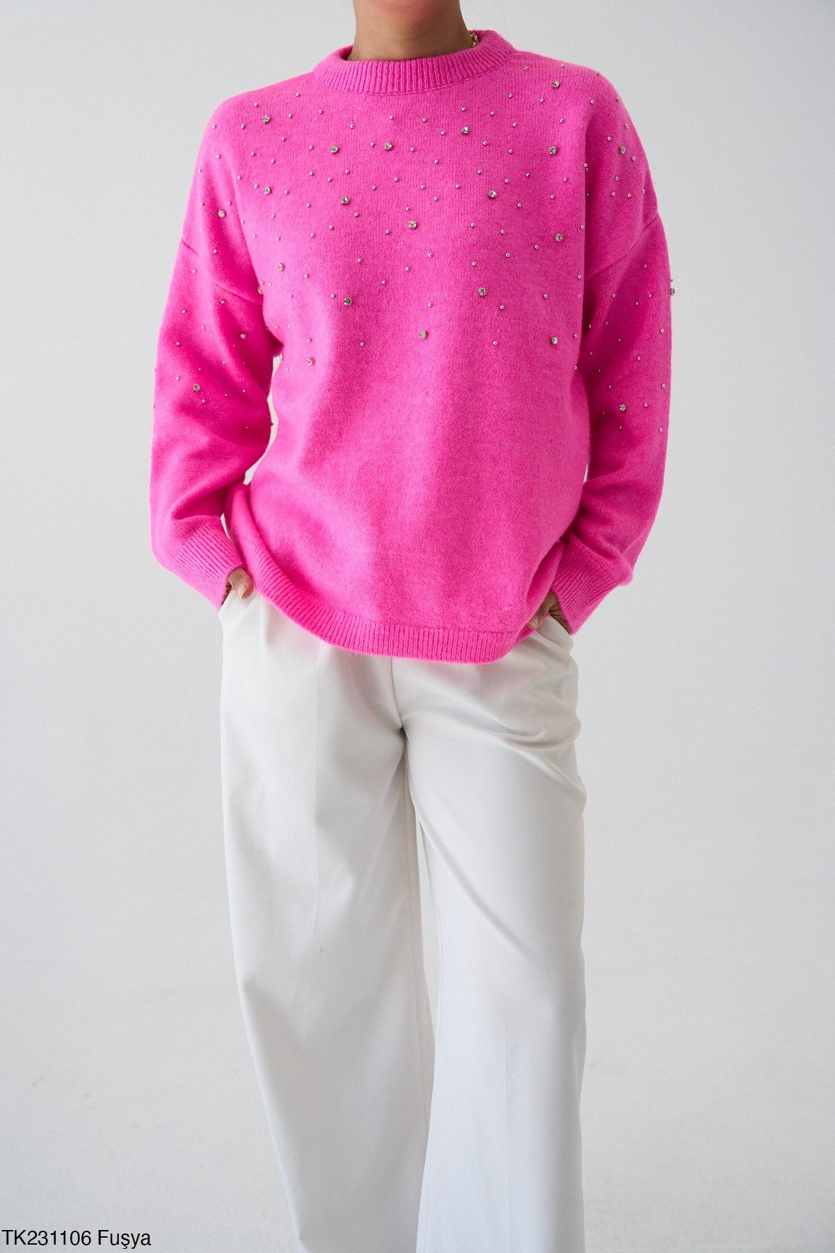 Bring instant impact to your winter edit with this soft knit jumper featuring scattered crystal embellishment. The luxe sparkle finish makes it a bestselling style for boutiques wanting statement pieces that photograph beautifully and sell quickly both in-store and online. The relaxed silhouette works perfectly with trousers, skirts and denim, offering a premium look at an incredible wholesale price.