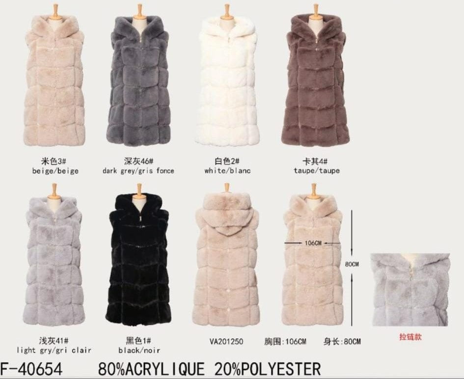 Elevate your collection with this premium, luxury-quality faux fur gilet. Crafted with super-soft faux fur and leather-look inner panels, this stylish piece offers both comfort and elegance. Featuring a zip fastening, a cosy hood, and two side pockets, it’s the perfect versatile layer for your customers.
