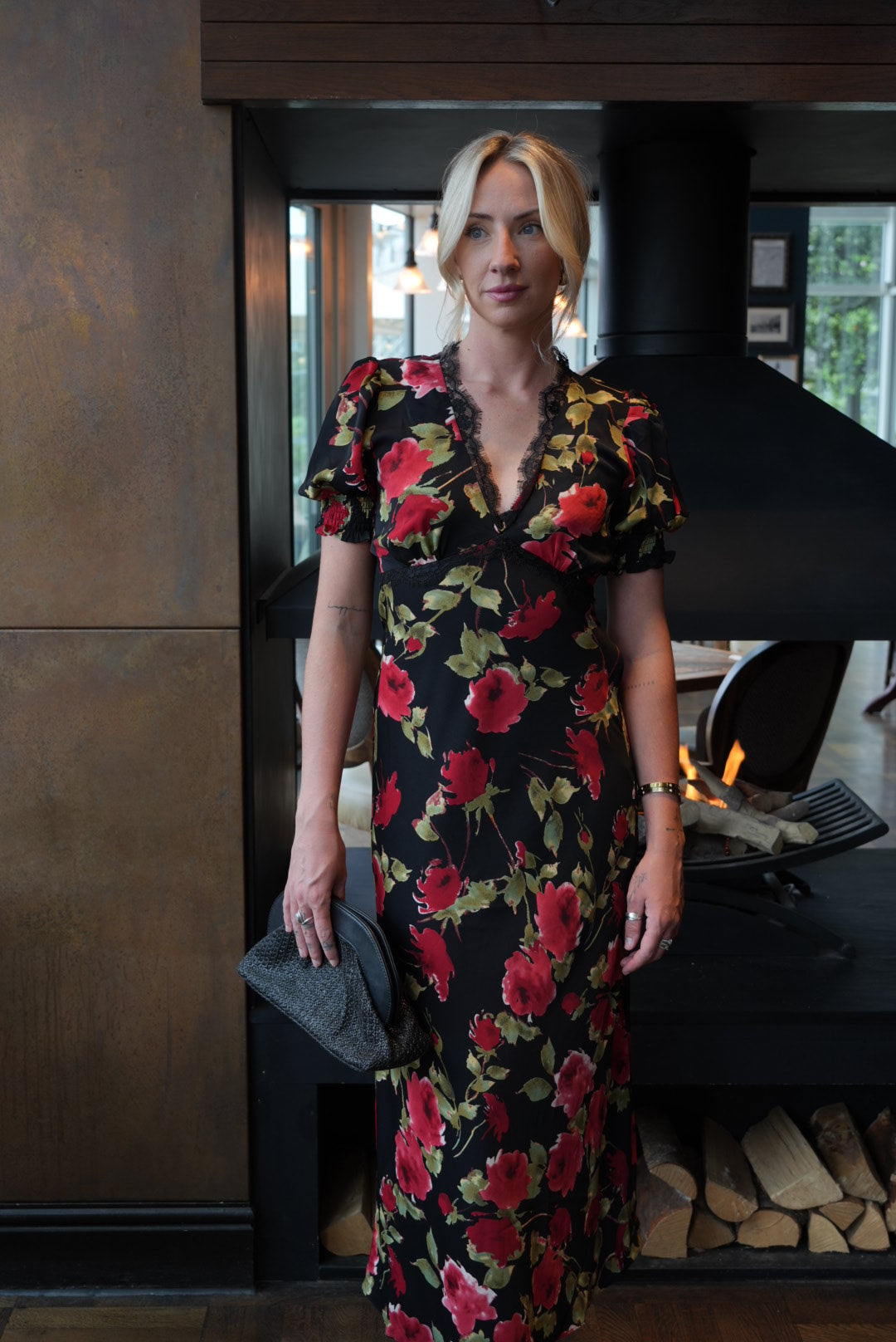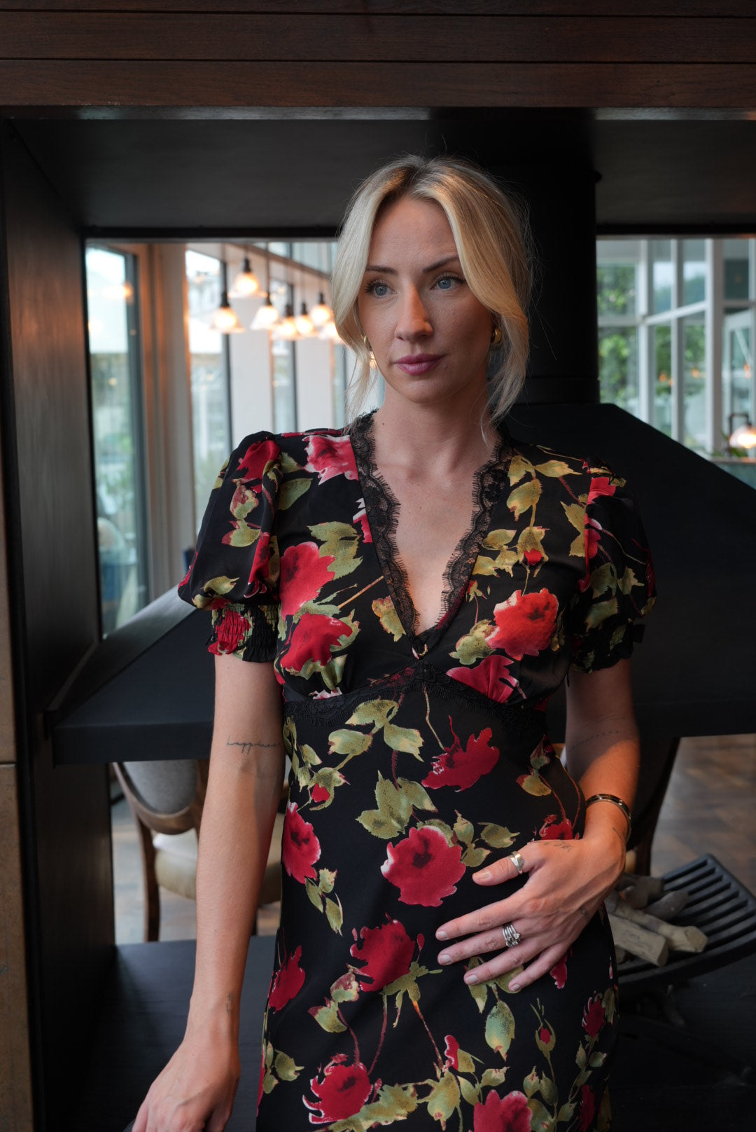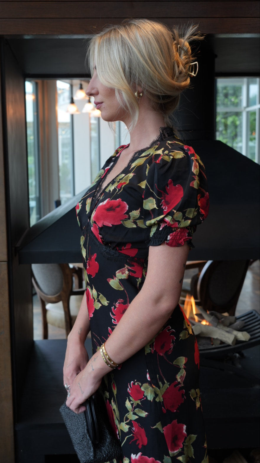 This Black Floral Lace Trim Detail Midi Dress combines casual comfort with bold style. Featuring delicate floral lace trims, it adds a touch of elegance while maintaining an easy, relaxed fit.