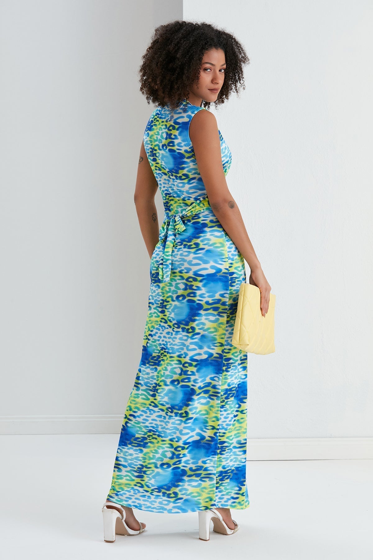 Embrace a wild yet elegant vibe with our Ella Twist Maxi Dress in Blue Leopard Print. This sleeveless maxi features a flattering V-neck and a chic twist front, designed with stretchy fabric that offers a relaxed fit for ultimate comfort. The wrap detailing at the back adds a sophisticated touch, making it perfect for any occasion.