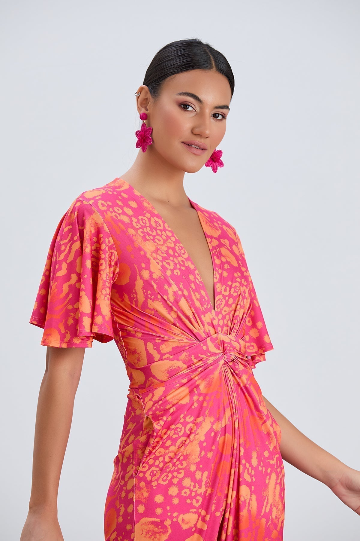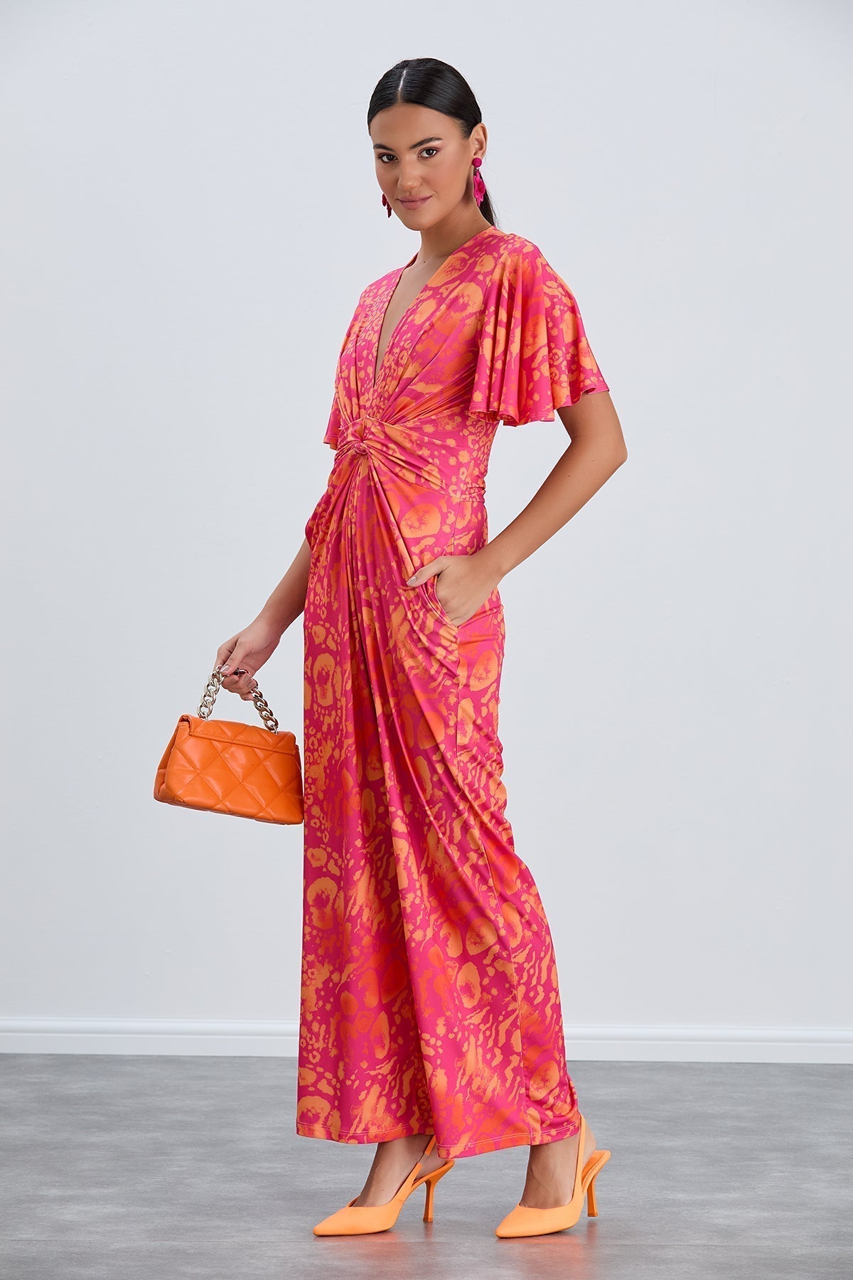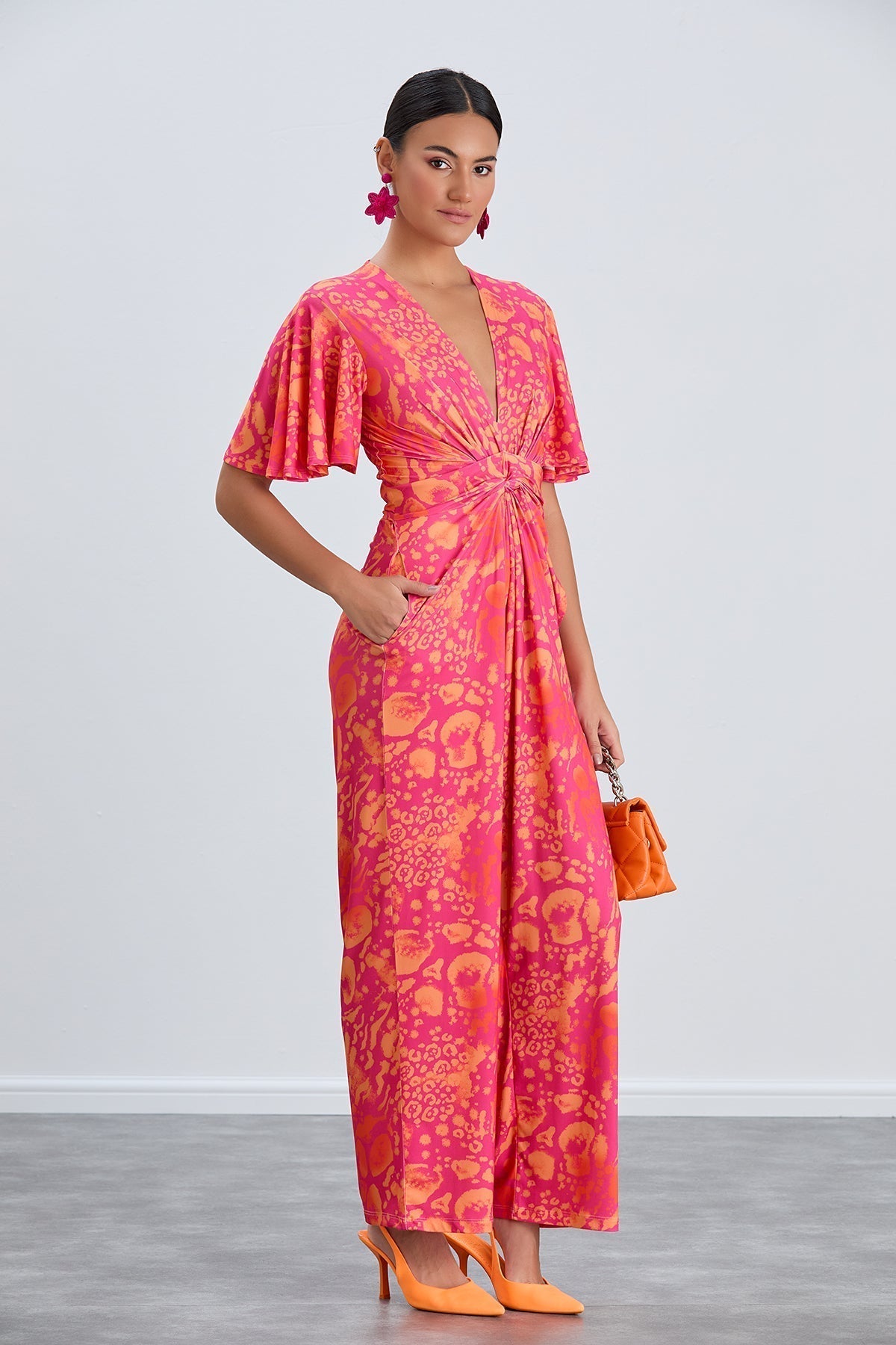Turn heads with our Tropical Fuchsia Angel Sleeve Maxi Jumpsuit, designed to make a bold statement. The vibrant tropical fuchsia print brings a burst of color, while the elegant twist front adds a touch of sophistication. Featuring flowy angel sleeves and wide legs, this jumpsuit offers both style and comfort, perfect for standing out at any occasion.