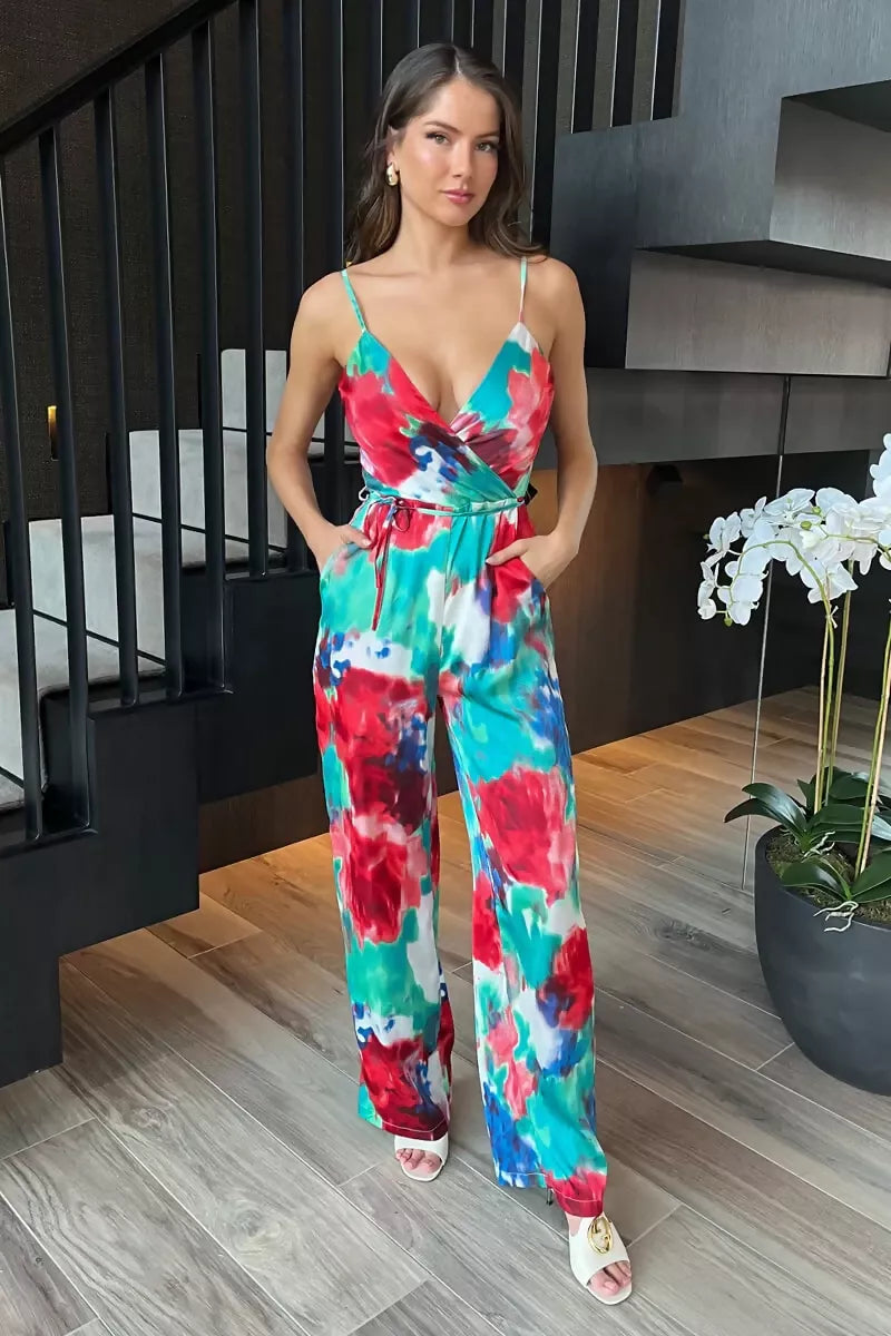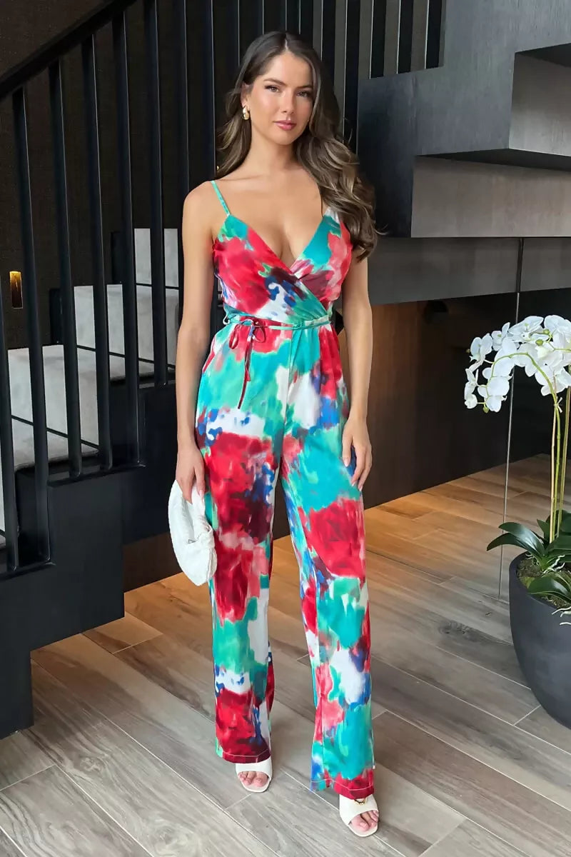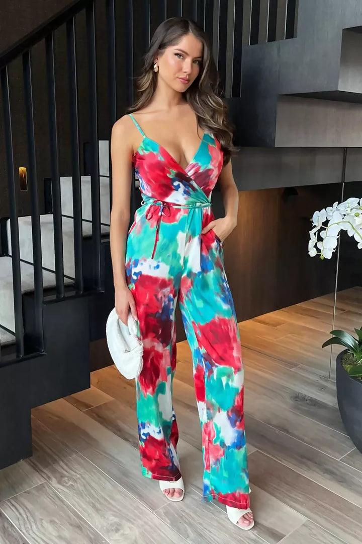 Our Multi Tie Dye Printed Strappy Tie Waist Jumpsuit is the perfect alternative to a dress. Featuring a wrap top, adjustable straps, a tie waist, a zip up back and wide leg full length trousers with pockets. Pair with heels and your favourite accessories for a glam summer evening look!