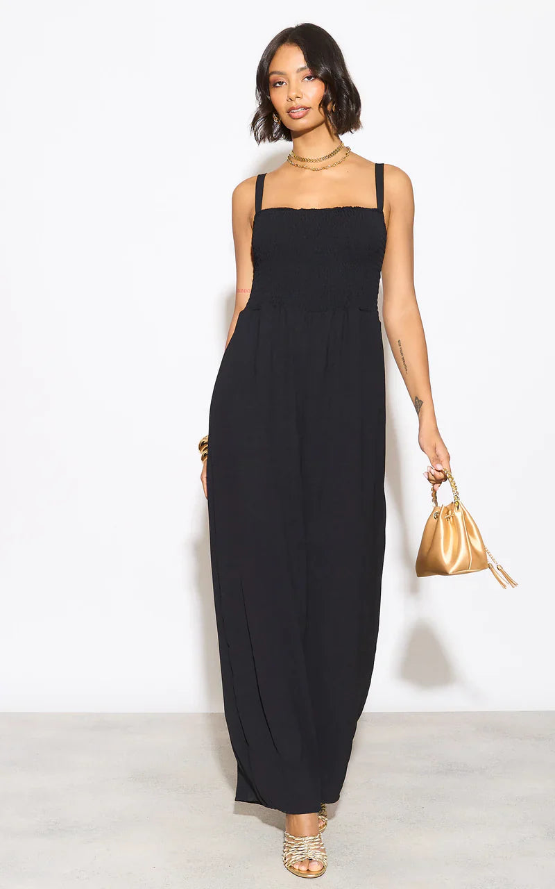 Meet your new go-to for effortless style: the Wide Leg Cami Jumpsuit in classic black. Crafted with a stretchy elasticated bust for the perfect fit and a flowy wide-leg silhouette, this jumpsuit combines ultimate comfort with chic, modern flair. The sleek design makes it a versatile must-have for any wardrobe.