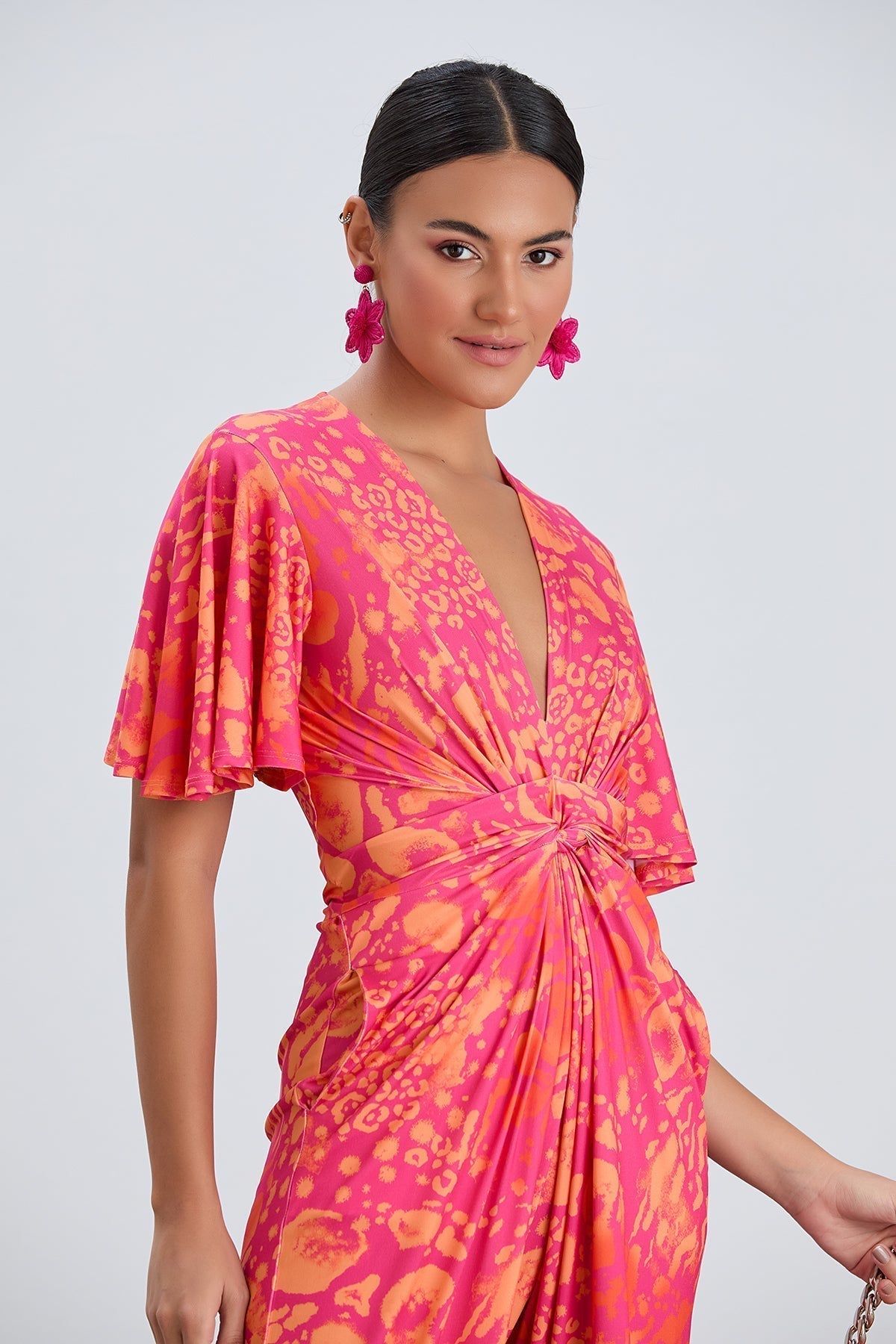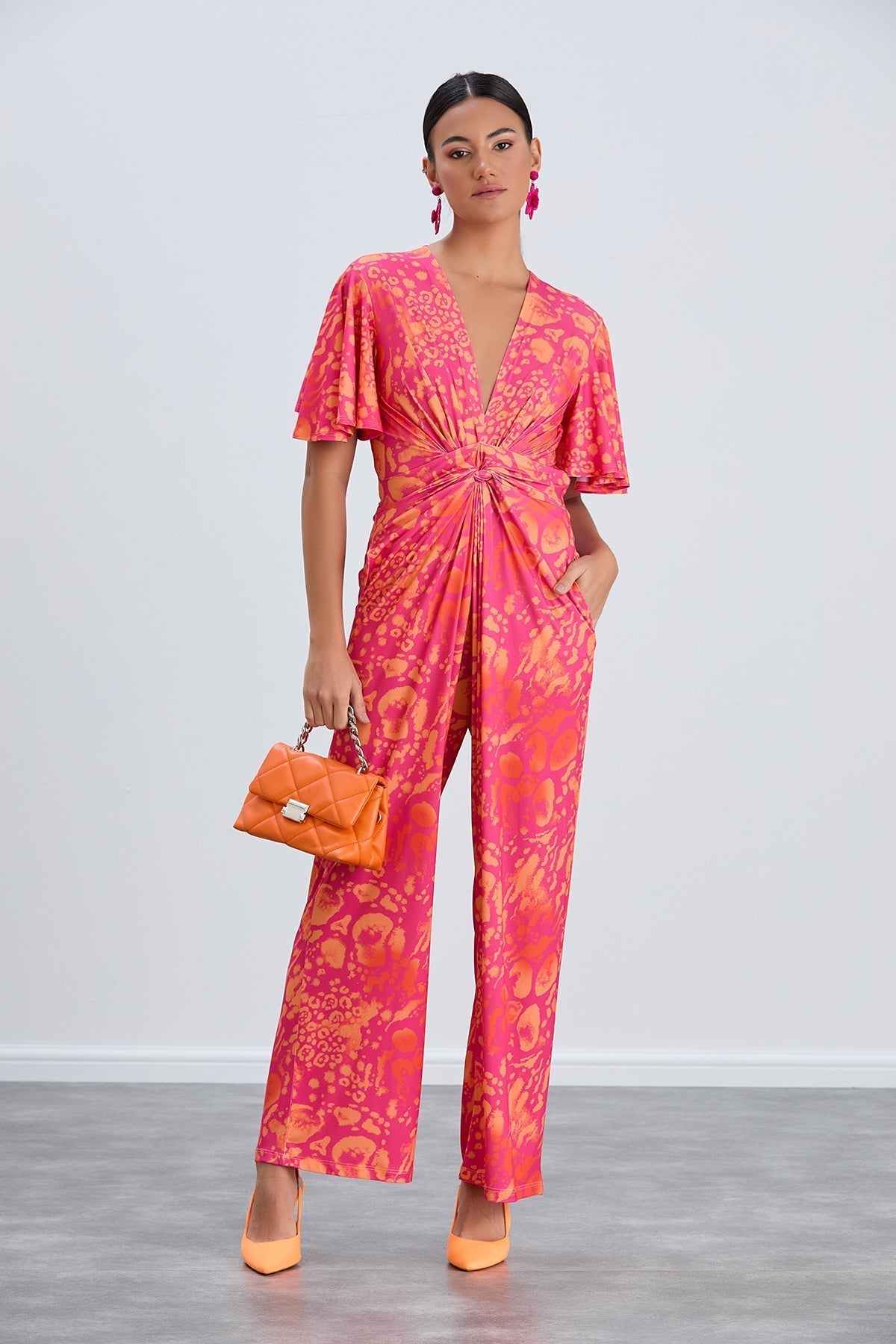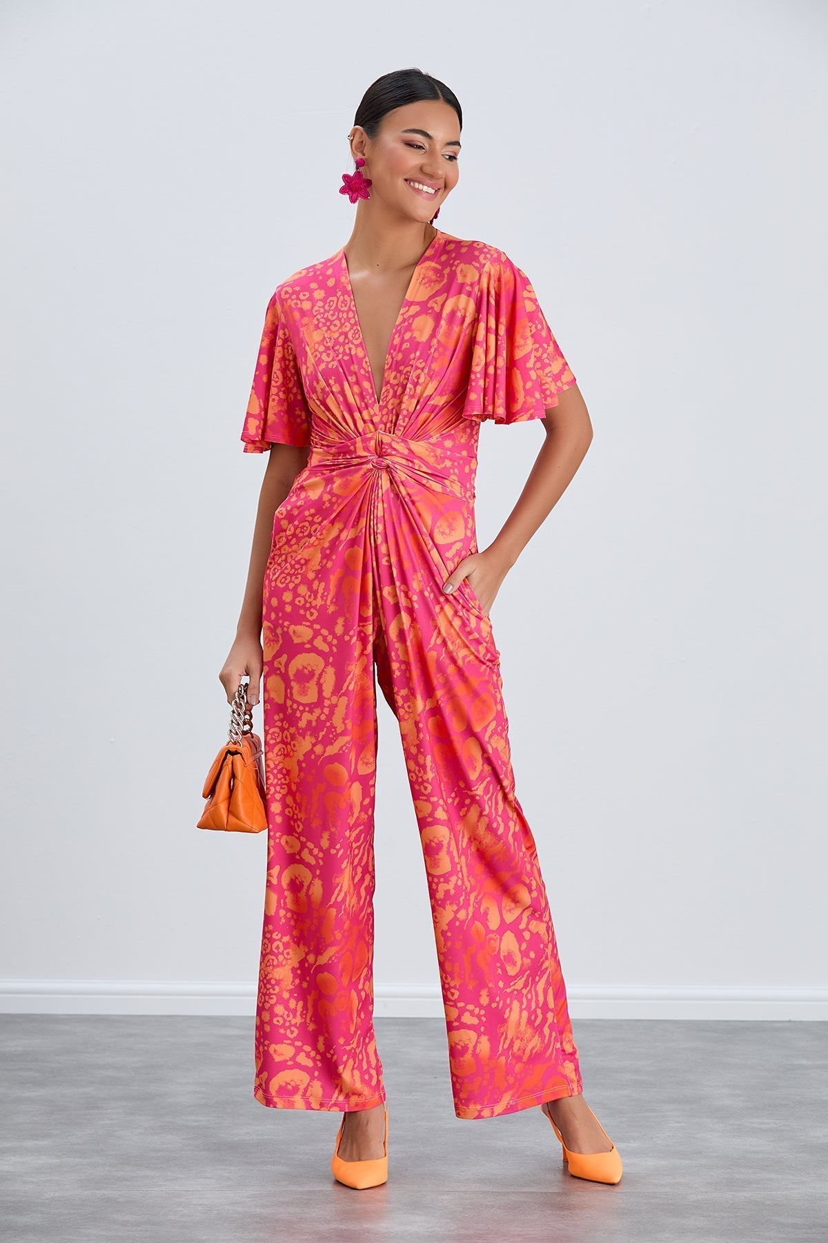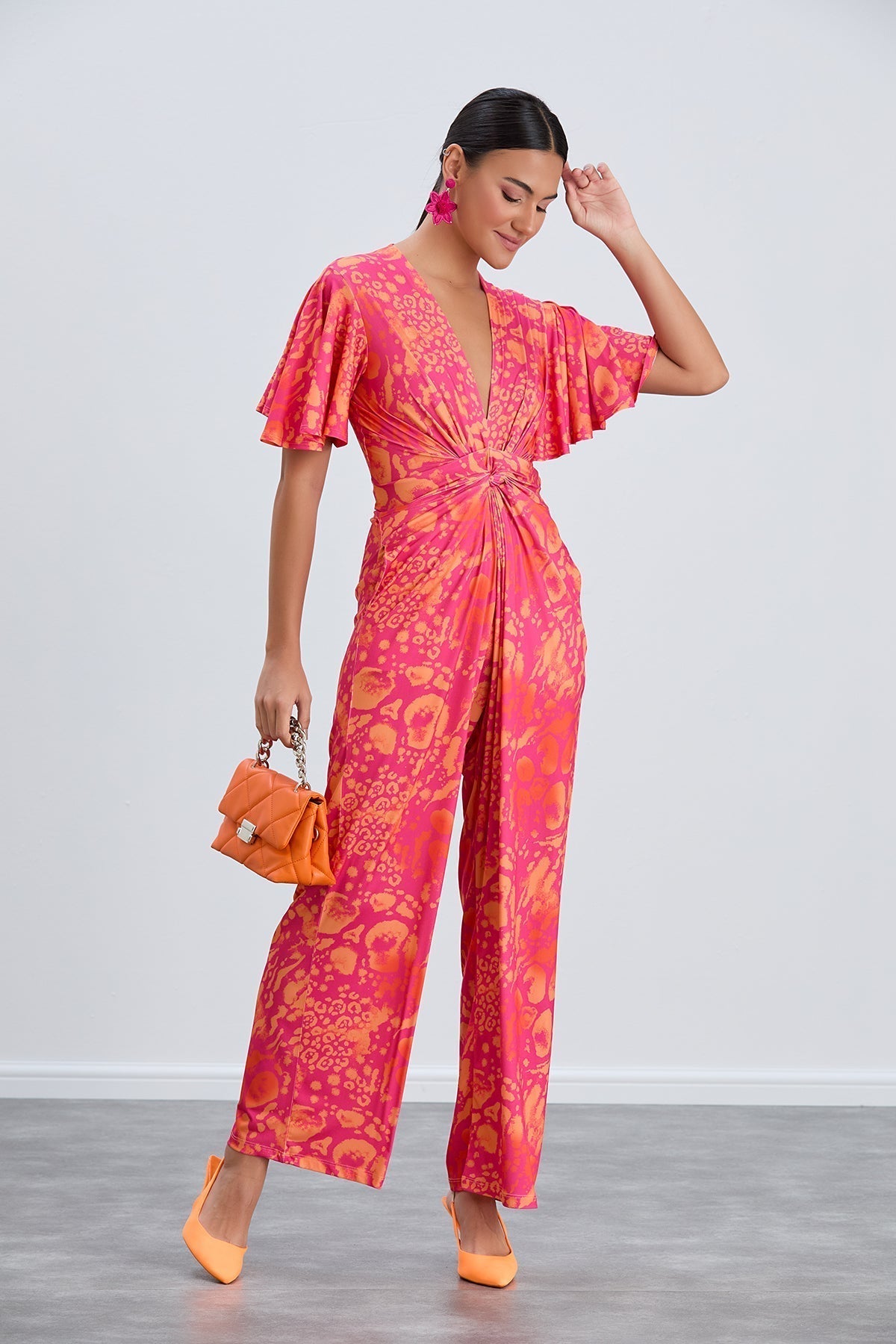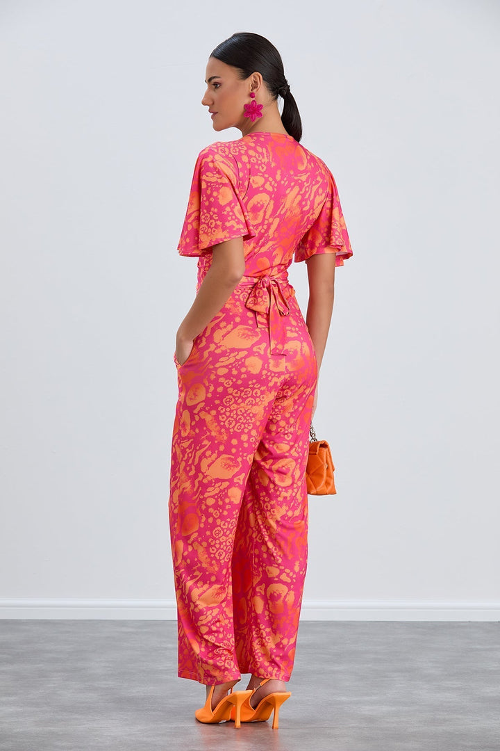 Turn heads with our Tropical Fuchsia Angel Sleeve Maxi Jumpsuit, designed to make a bold statement. The vibrant tropical fuchsia print brings a burst of color, while the elegant twist front adds a touch of sophistication. Featuring flowy angel sleeves and wide legs, this jumpsuit offers both style and comfort, perfect for standing out at any occasion.