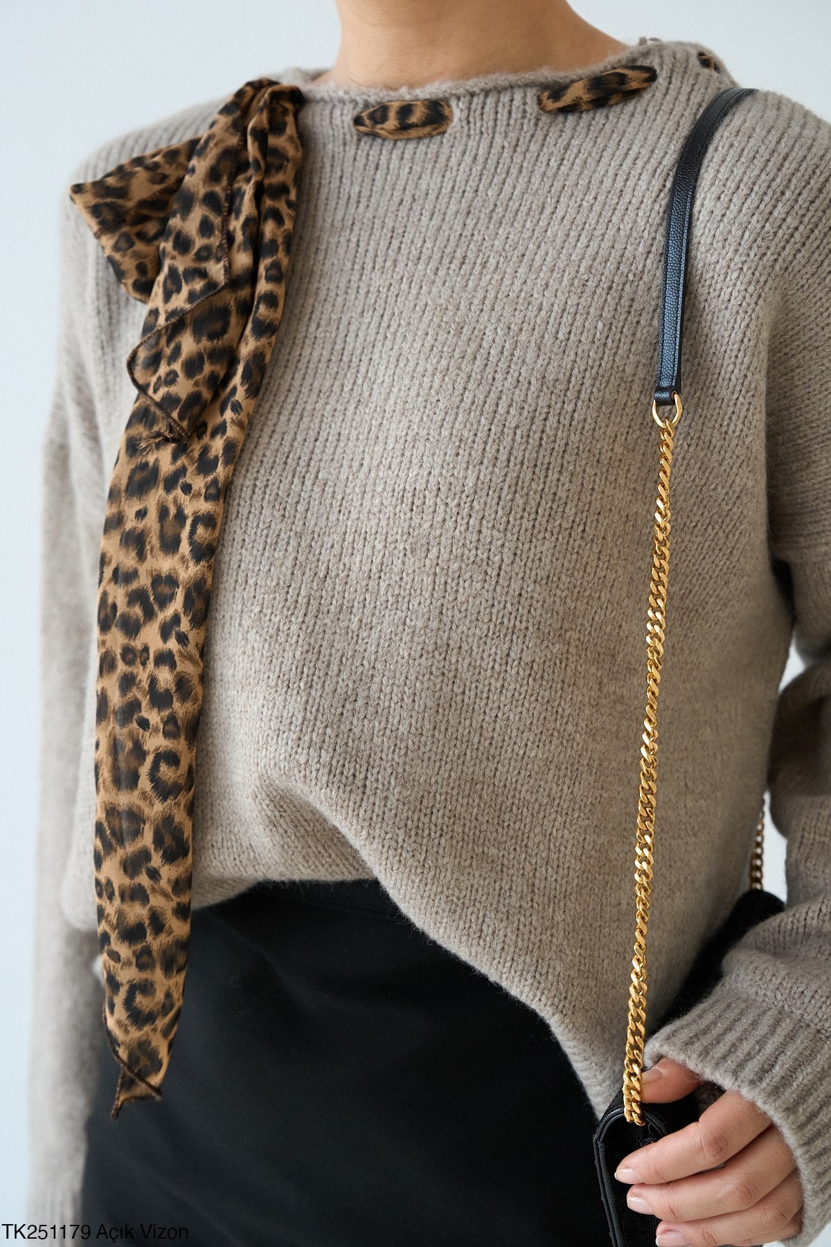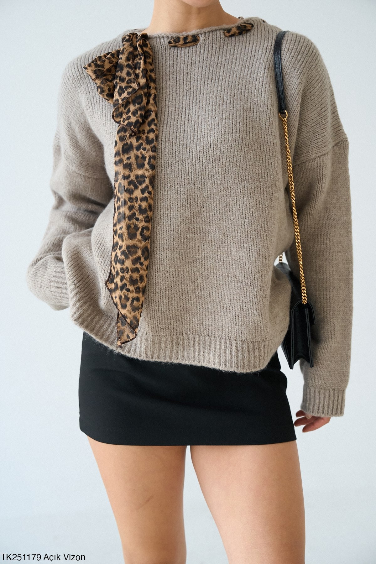 A soft and comfortable knit jumper elevated with a striking leopard-print tie neckline. Styled with a relaxed fit, dropped shoulders and ribbed edges. A versatile neutral with a stylish twist.