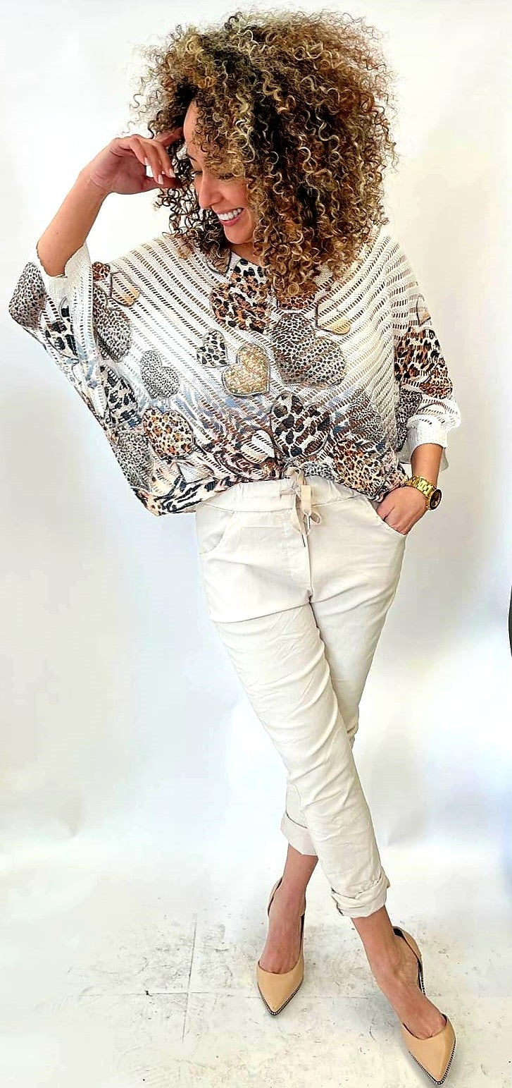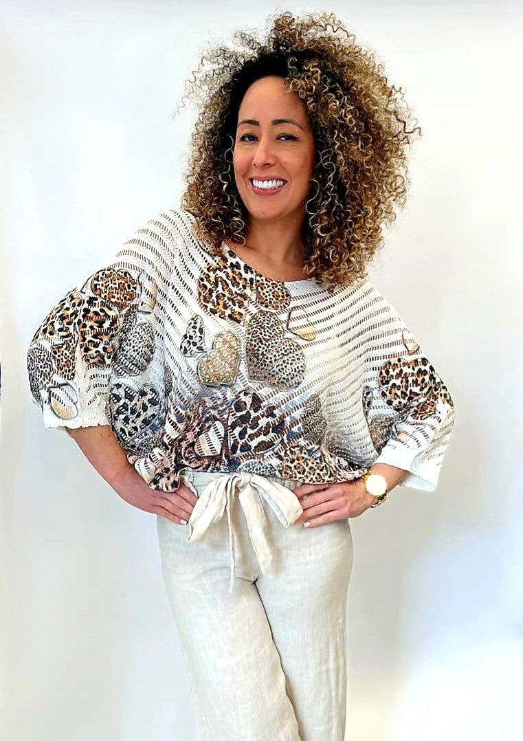 Your new bestseller. Featuring a leopard heart motif, scallop V-neck, and heavier crochet texture — it’s fashion-forward, breathable, and ultra-soft. Great for layering or transitional styling.