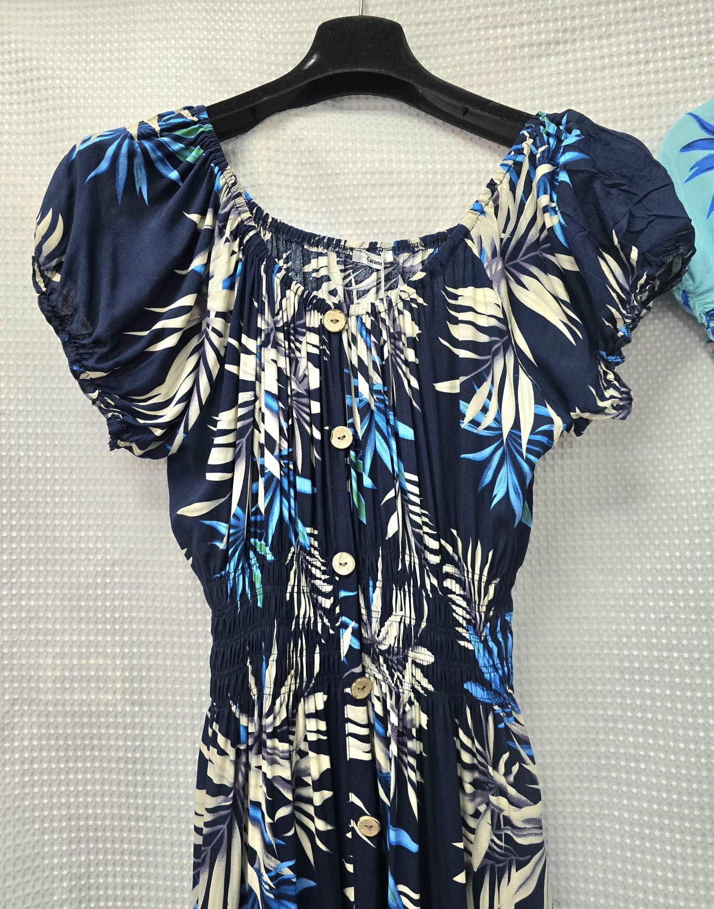 Turn heads with this tropical palm printed bardot maxi. With faux button detail, ruched neckline, and stretchy waistband, it's easy to wear and ultra flattering. Can be styled on or off the shoulder.
