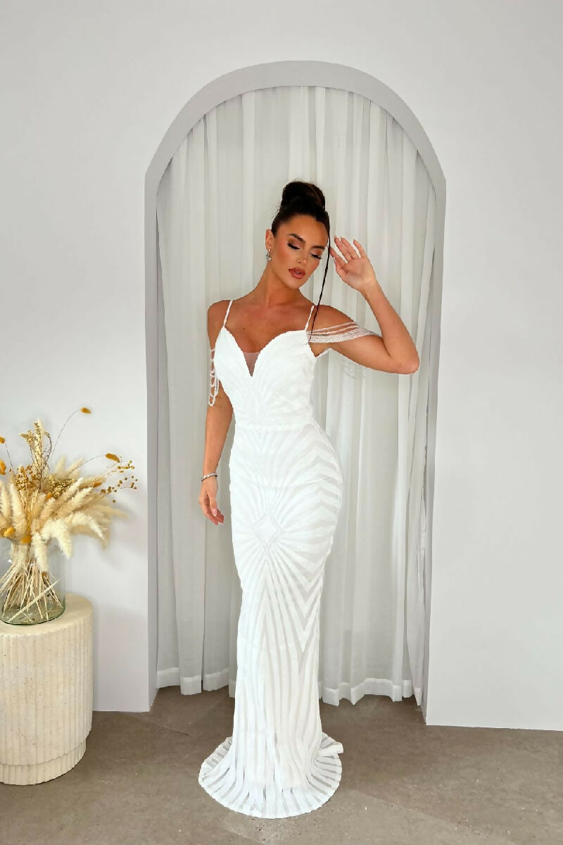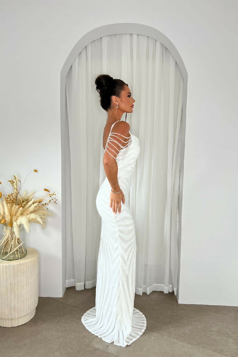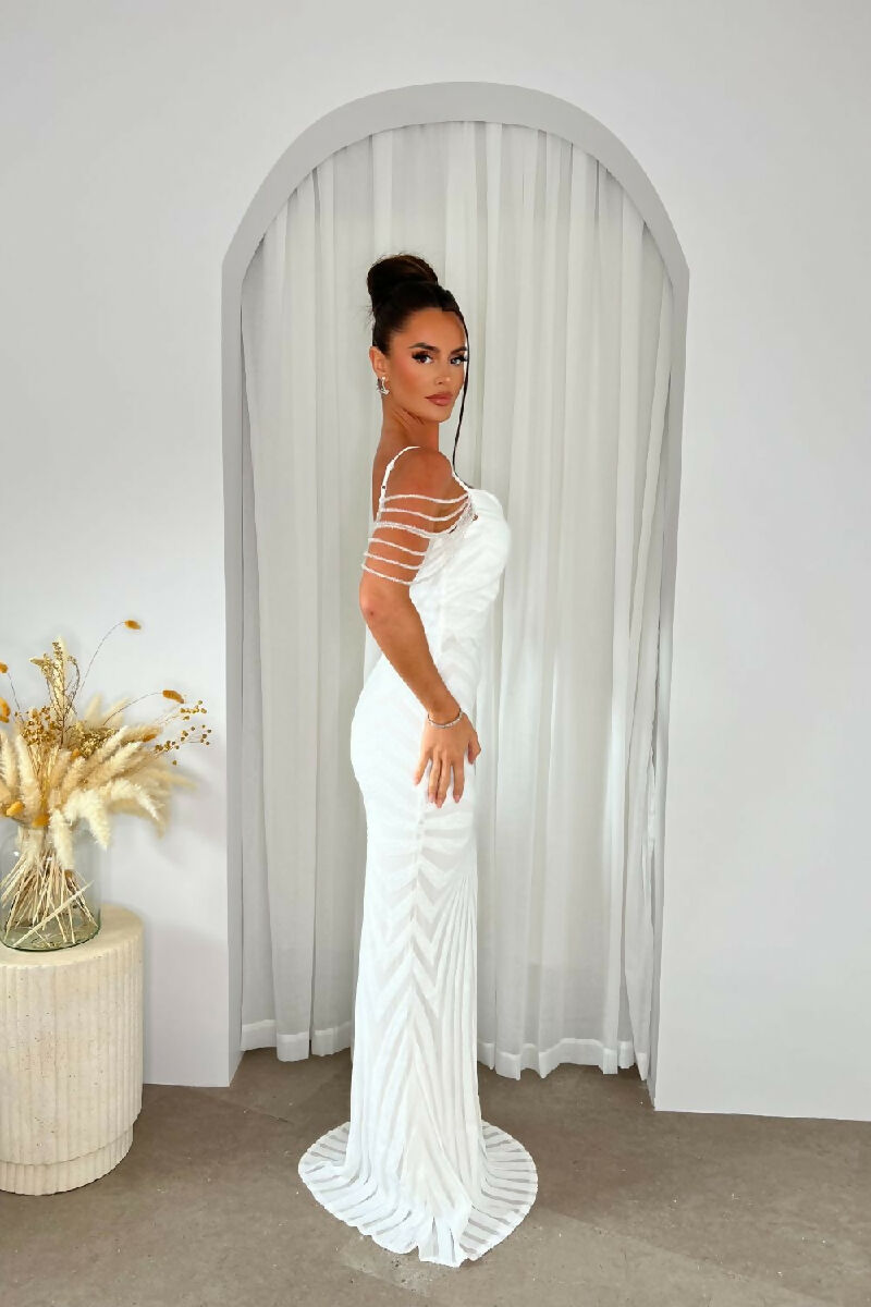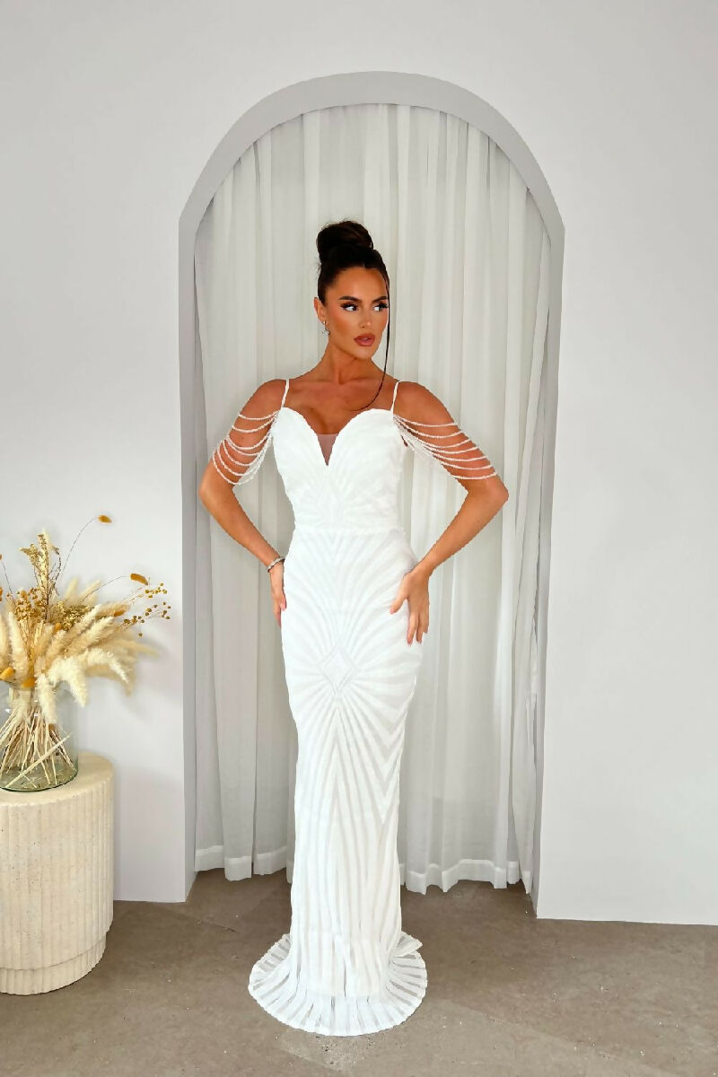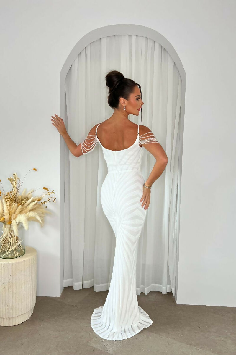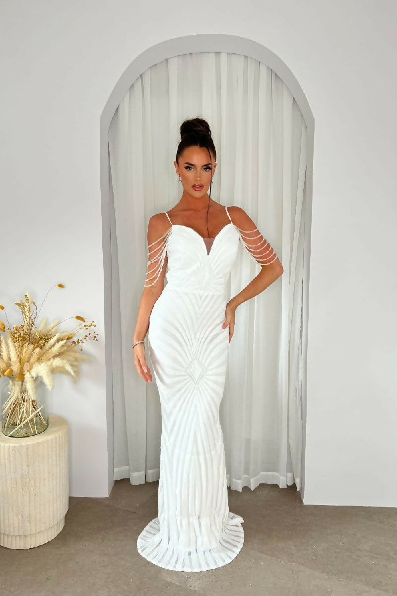 (5-7P.PACK) Vanity White Luxe Beaded Sequin Maxi Dress