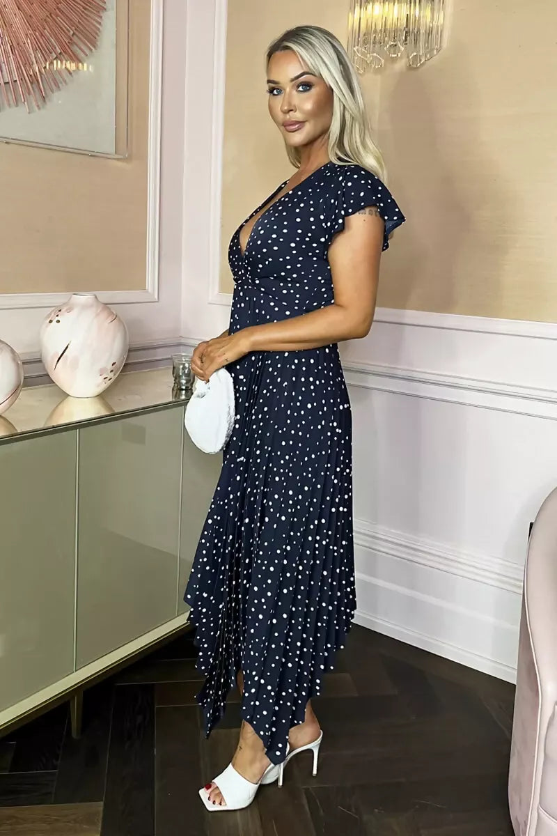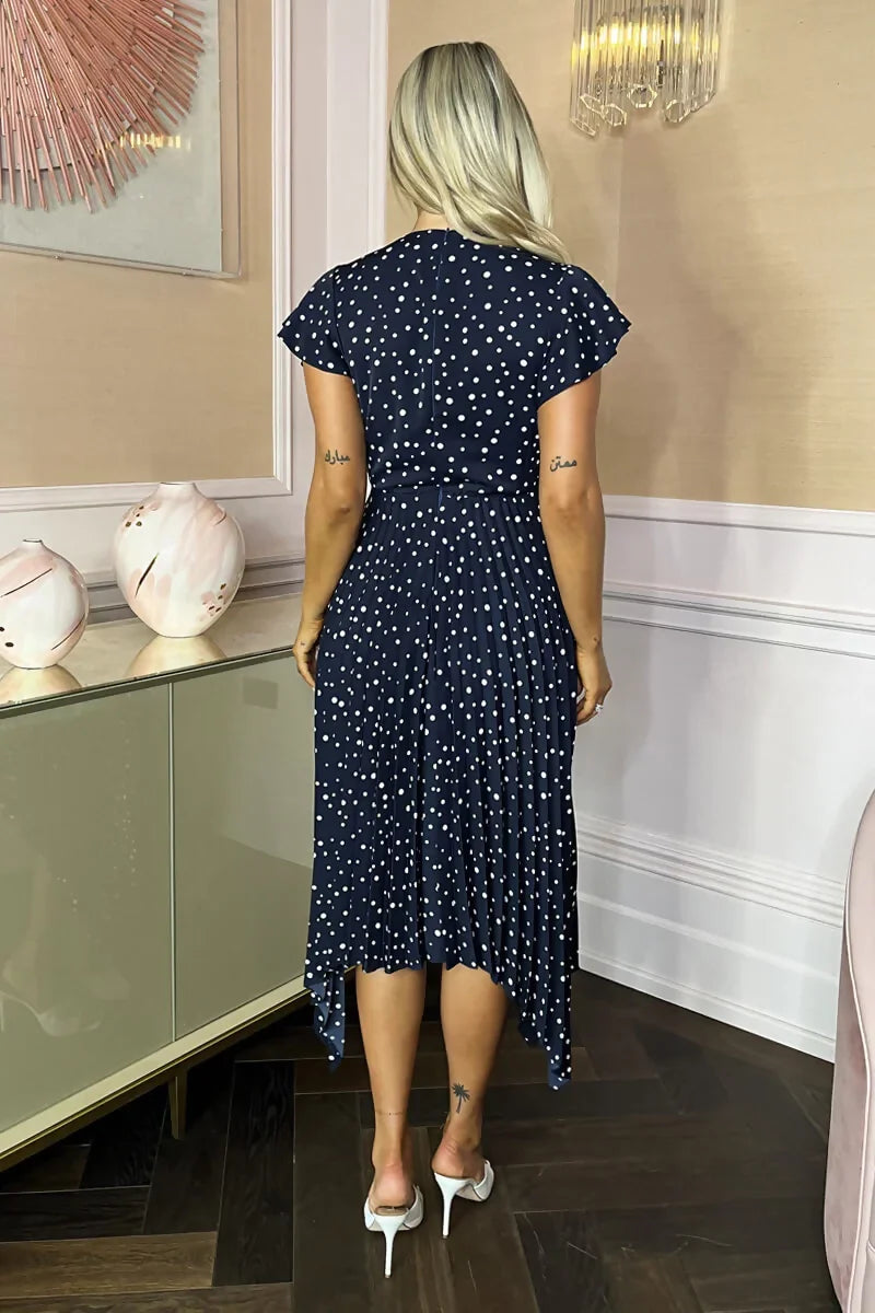 Our Navy Polka Dot Print Wrap Top Zig Zag Hem Pleated Midi Dress is the perfect dress for any occasion. Featuring a wrap over top, a V shaped neckline, flutter sleeves, a pleated midi skirt with a zig zag hem and a zip up back. Team it with some cute heels to complete the look!