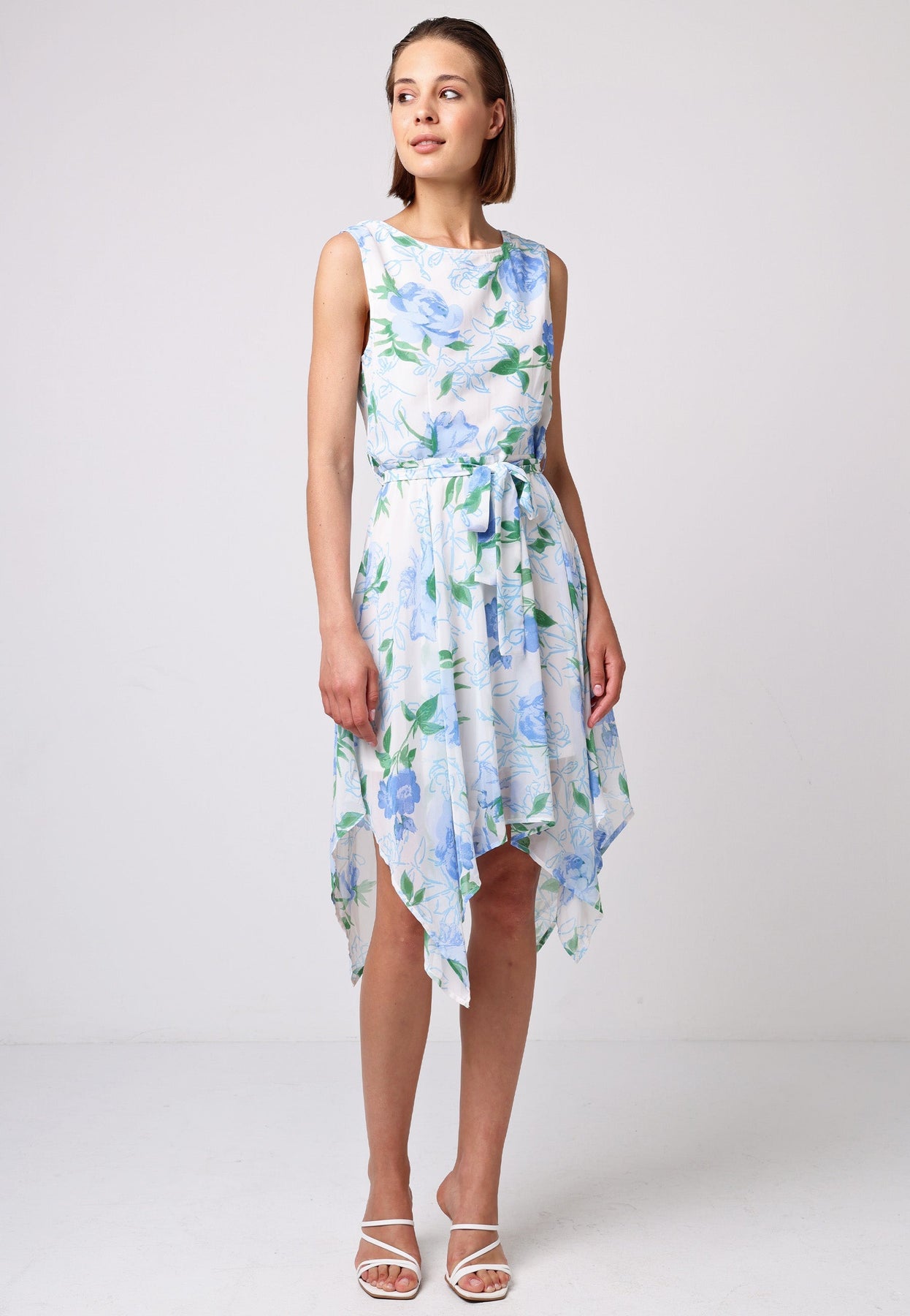 Impress in the Asymmetrical Hem Tie Belt Mini Dress in White Blue Floral. This classic shape is elevated by the assymetrical hem that flows with movement. A modest crew neckline with a mini length feels comfortable and flirty. Elegant light blue florals on a white, chiffon base. Easy-to-wear for any summer event abd re-wear again for weekend plans. Dress up with white heels and accessories for a cool look or dress down with sandals.