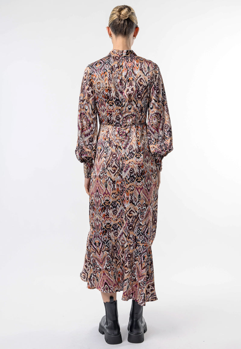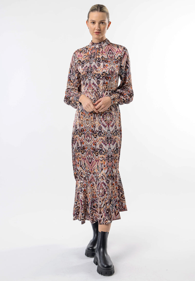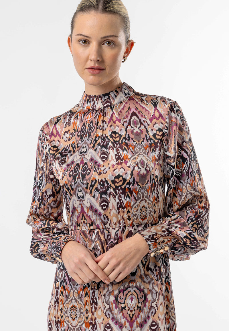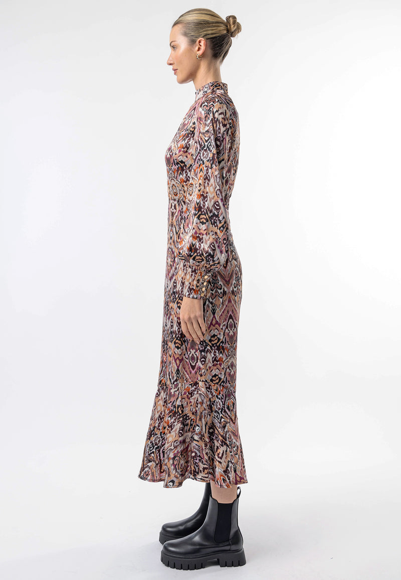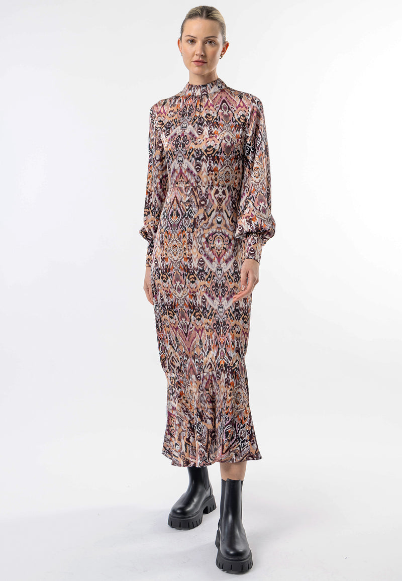This most loved High Neck Long Tea Satin Dress by ANGELEYE now comes in the new season Tan Boho Print. Long sleeves, high neck and long skirt make this dress a cooler season must-have. The same style you love in an updated boho, cool toned print in tans with pops of pink. Match with a leather jacket and a pair of high stilettos or even just white sneakers to complete the look.