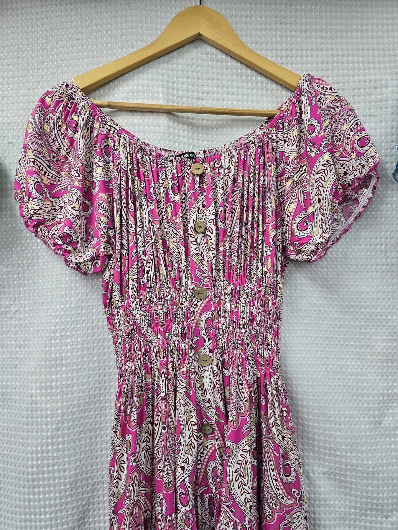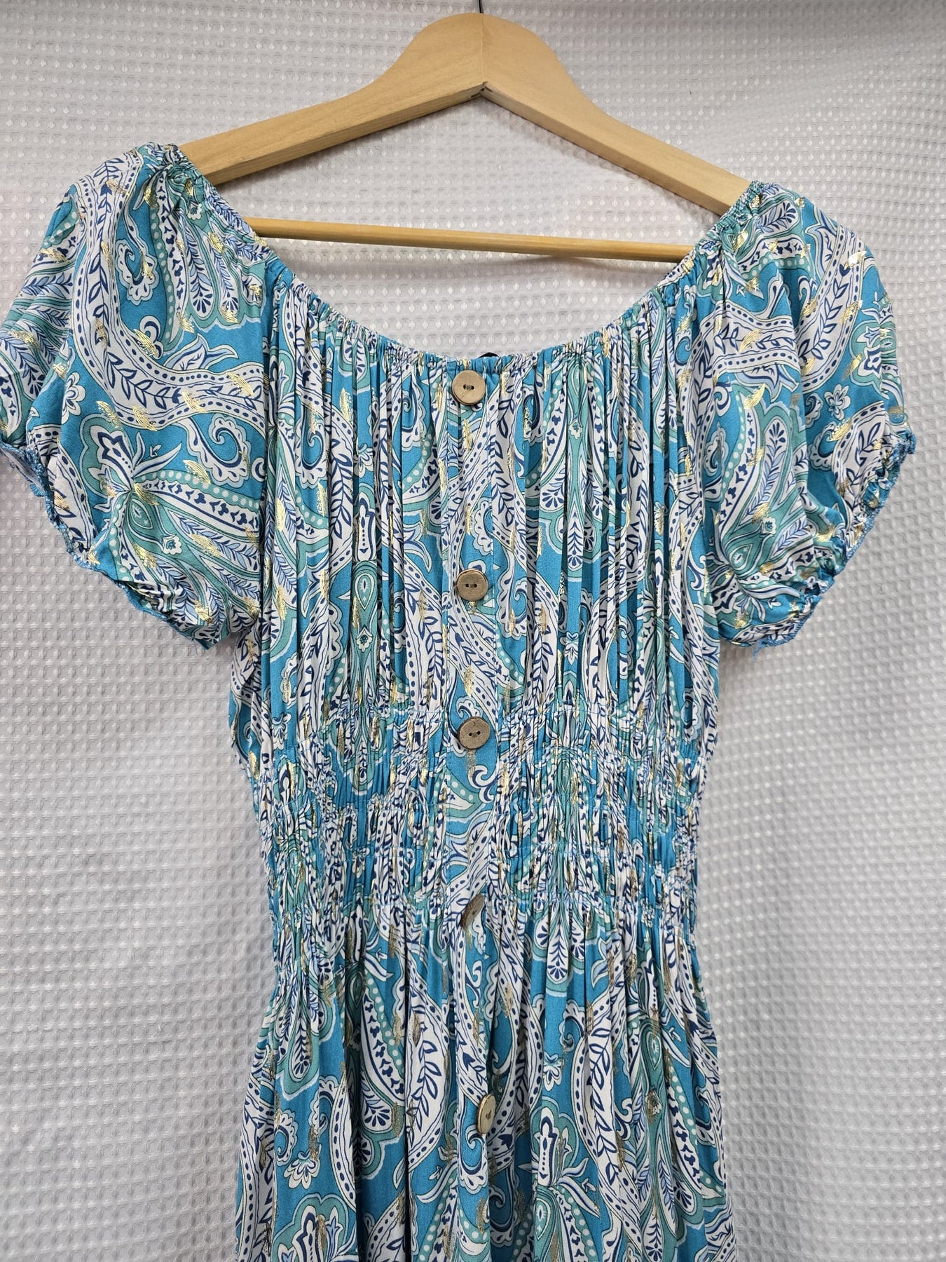 Timeless paisley print with gold foil detailing. Includes side pockets, elasticated waist and ruched neckline for a feminine fit. One of our bestselling shapes.