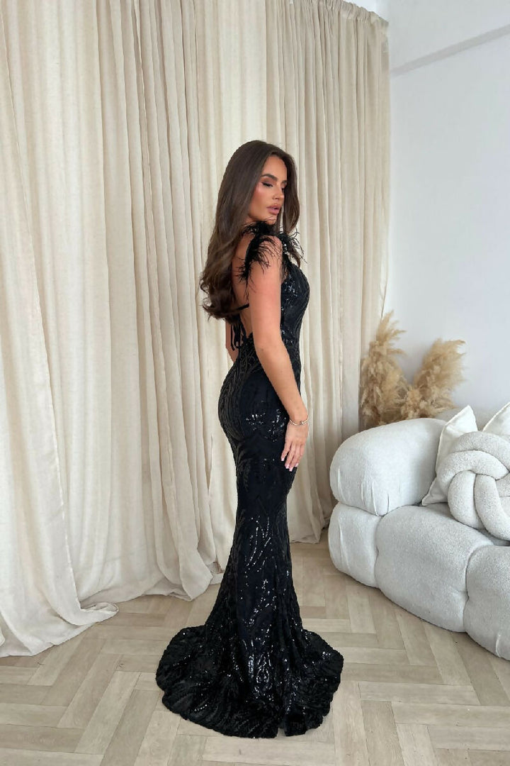 Make a bold statement with the Trophy Black Luxe Plunge Feather Maxi Dress, the perfect blend of sophistication and drama. Featuring intricate tribal sequin embellishments, feather-trimmed shoulders, and a show-stopping adjustable open back, this gown is designed for unforgettable moments.