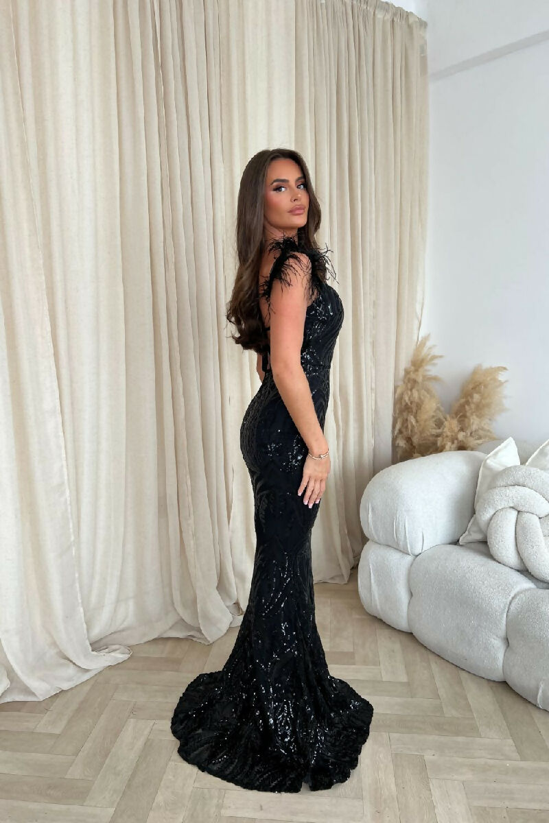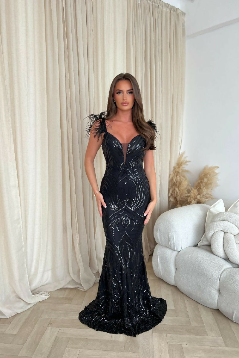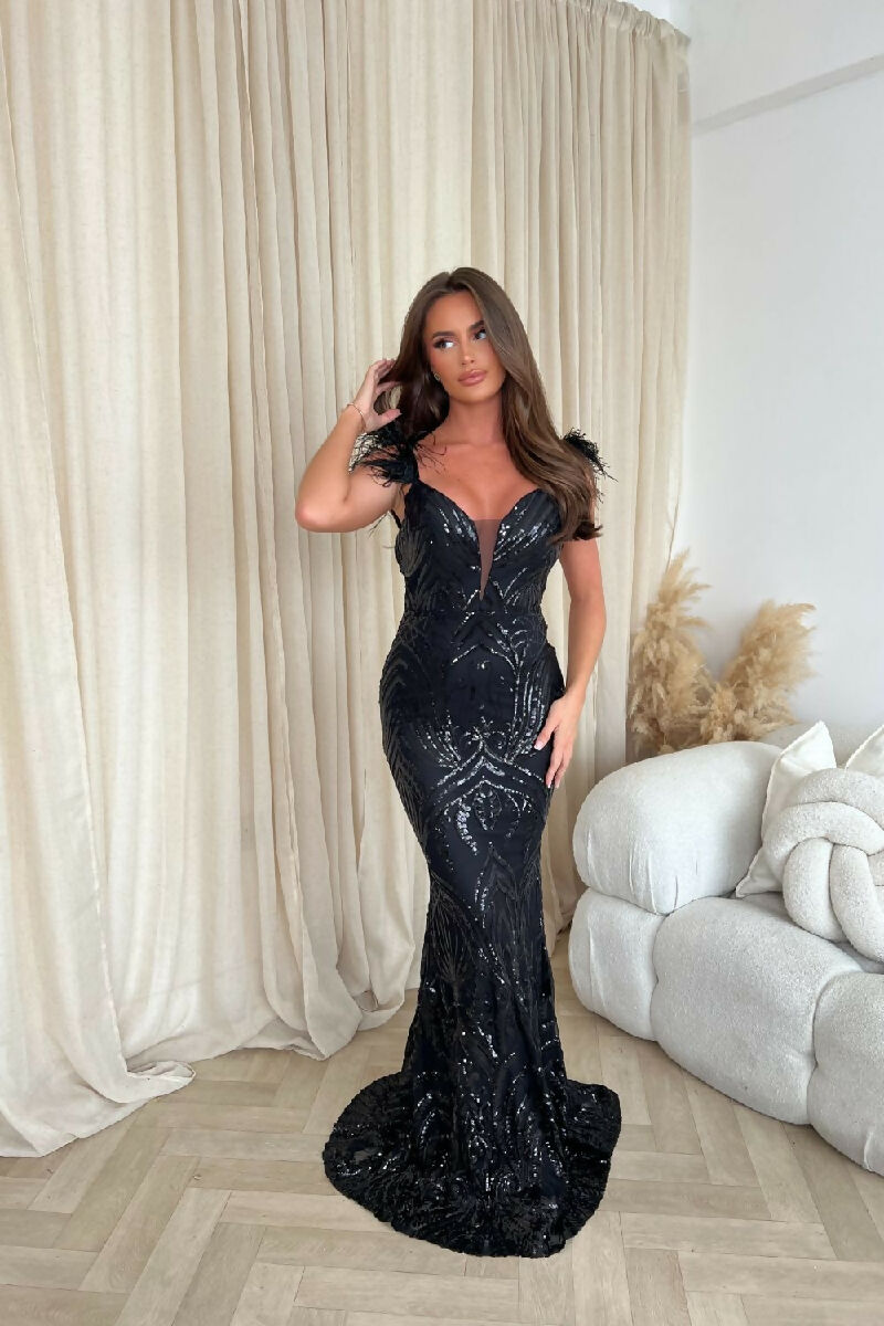 (4-5P. PACK) Trophy Black Luxe Plunge Feather Maxi Dress