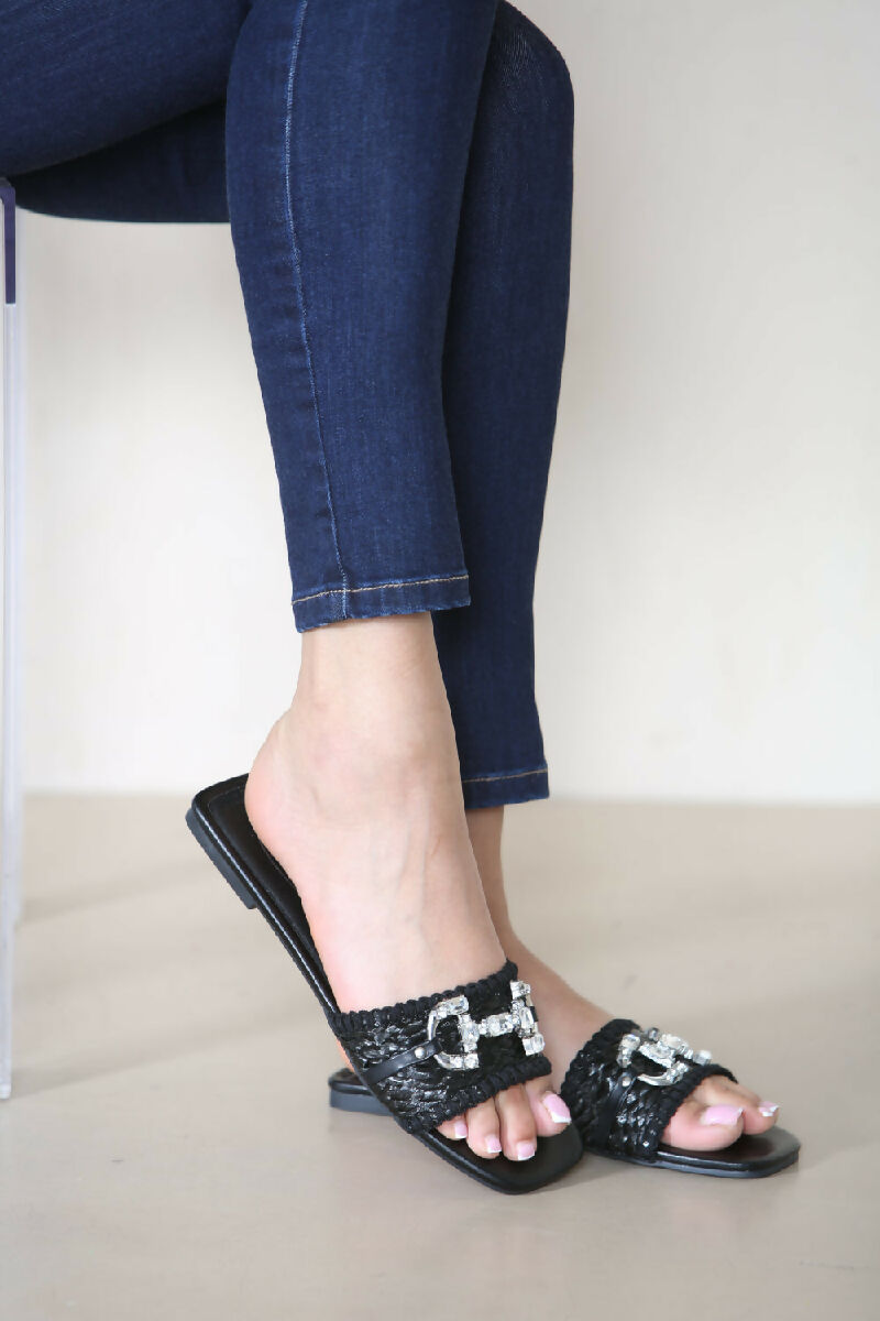BLACK FLAT DIAMANTE TRIM DETAIL MULES CASUAL SANDALS (PACK OF 12 PAIRS UK3-UK8)