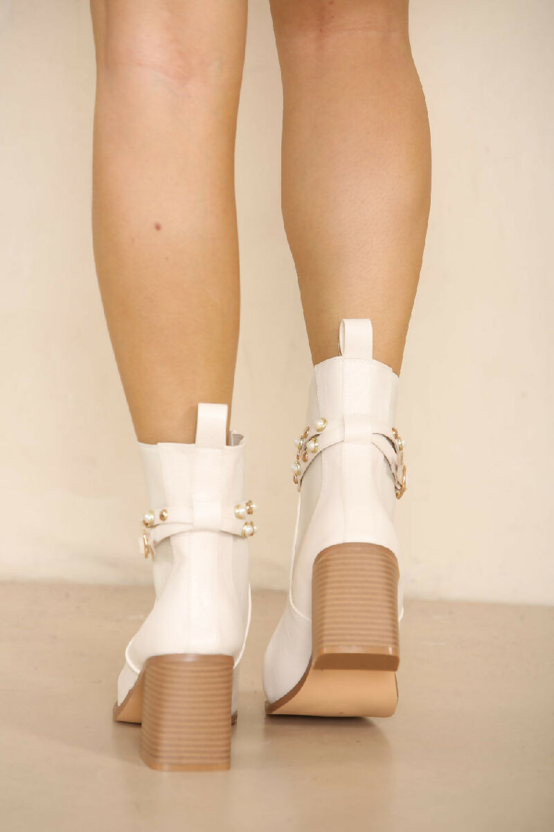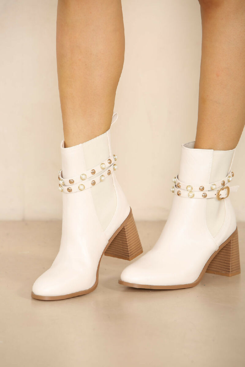 CREAM PU BLOCK HEEL ANKLE BOOTS WITH FAUX PEARL DETAIL (PACK OF 12 PAIRS UK3-UK8)
