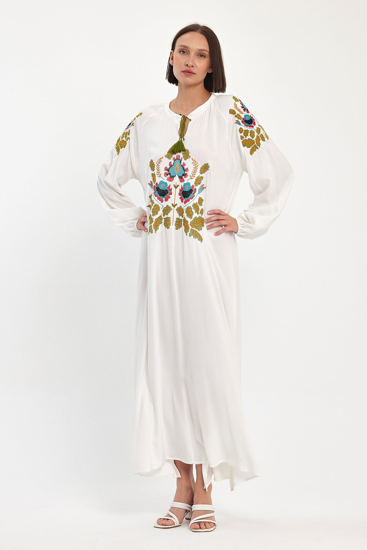 A timeless maxi dress featuring intricate embroidered detailing across the front and sleeves, designed to make a statement while remaining effortless to wear. Crafted in a lightweight, fluid fabric, this style flows beautifully with movement and offers a flattering silhouette across sizes.