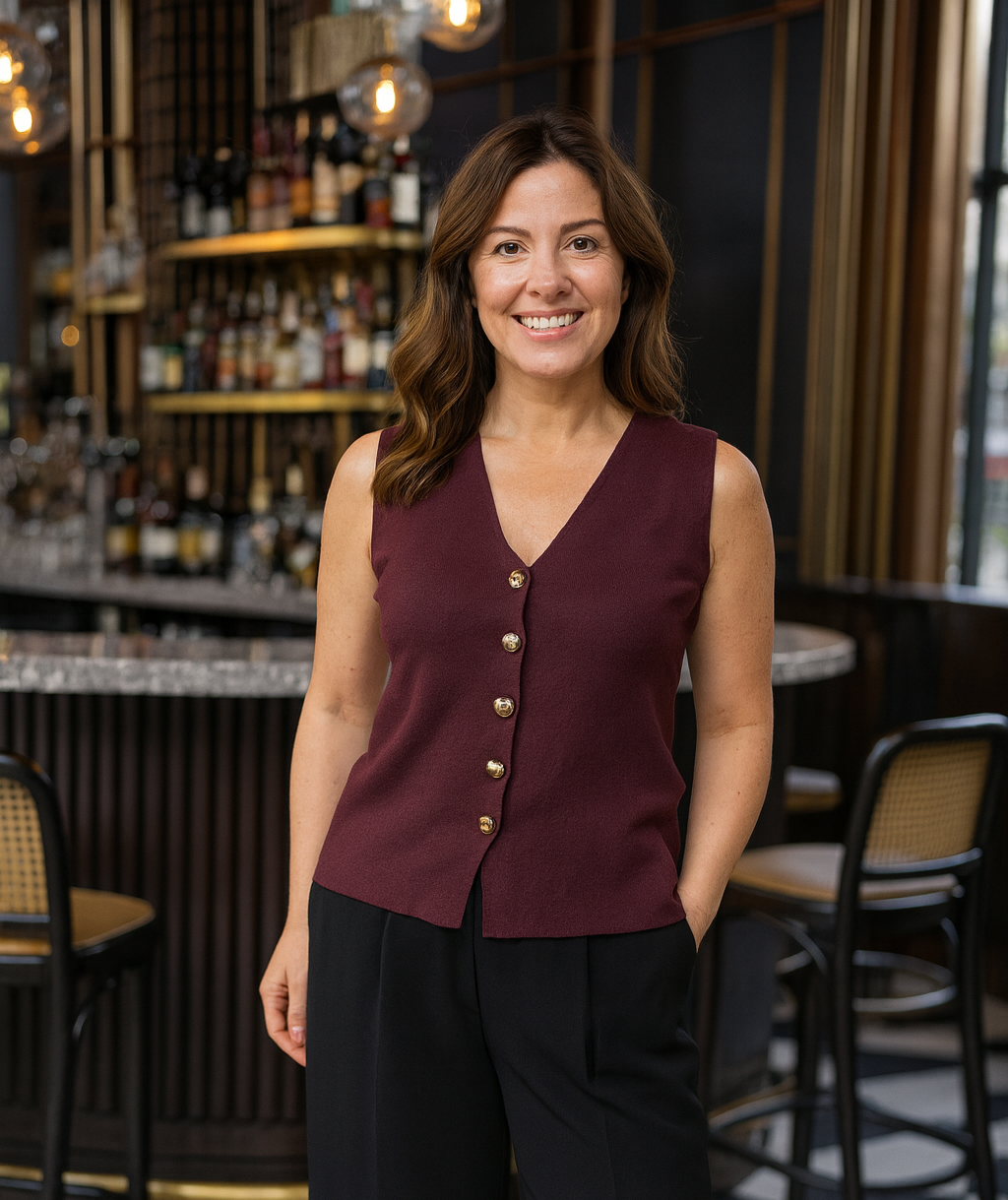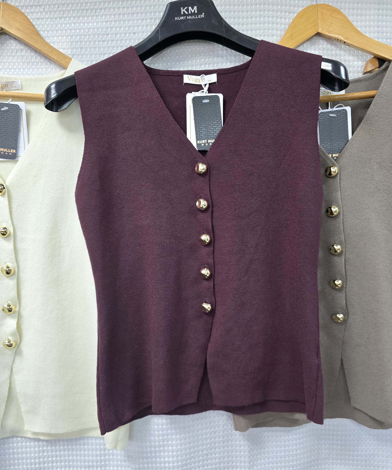 New season arrivals. Classy V neck waistcoat with stylish 5 gold button fastening, lightweight relaxed fit. Team with our jeans, skirts or zra trousers.