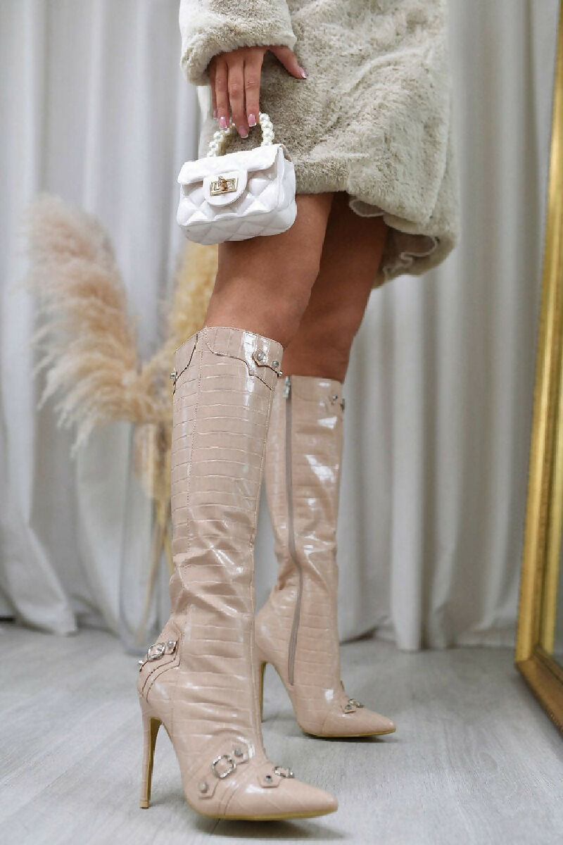 Nude Croc Calf High Heel Boots With Pointed Toe & Side Zip (PACK OF 12 PAIRS UK3-UK8)