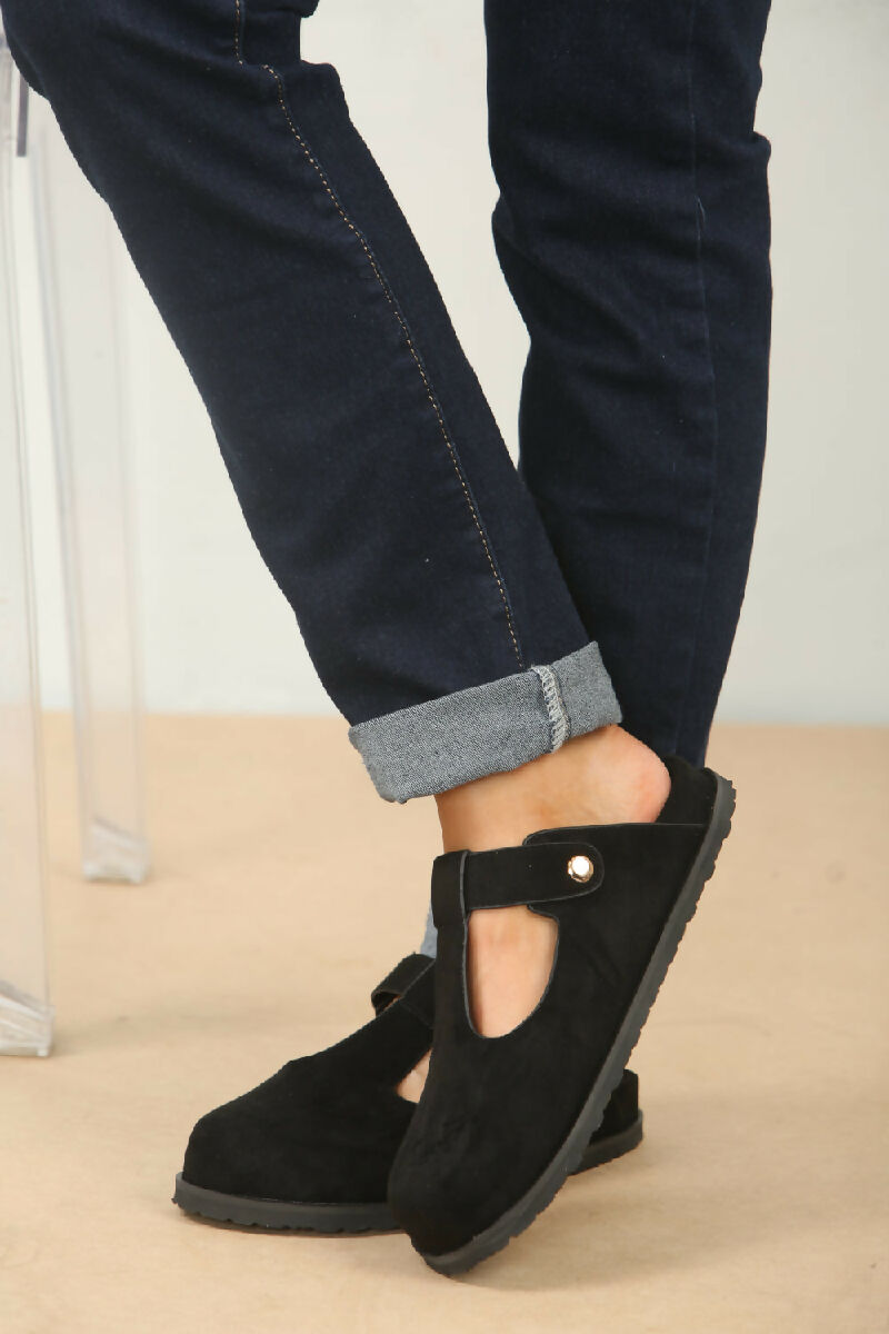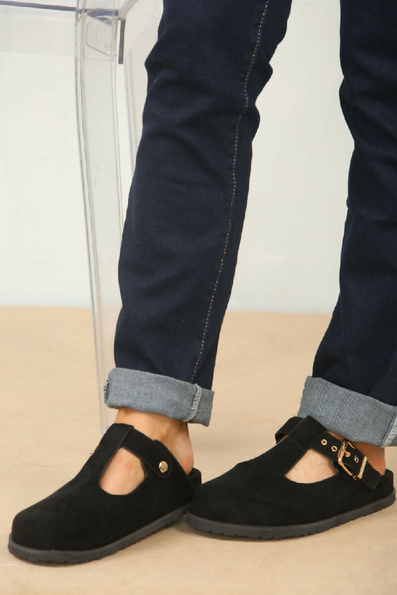 SLIP ON SPLIT BLACK SUEDE CLOGS WITH BUCKLE (PACK OF 12 PAIRS UK3-UK8)