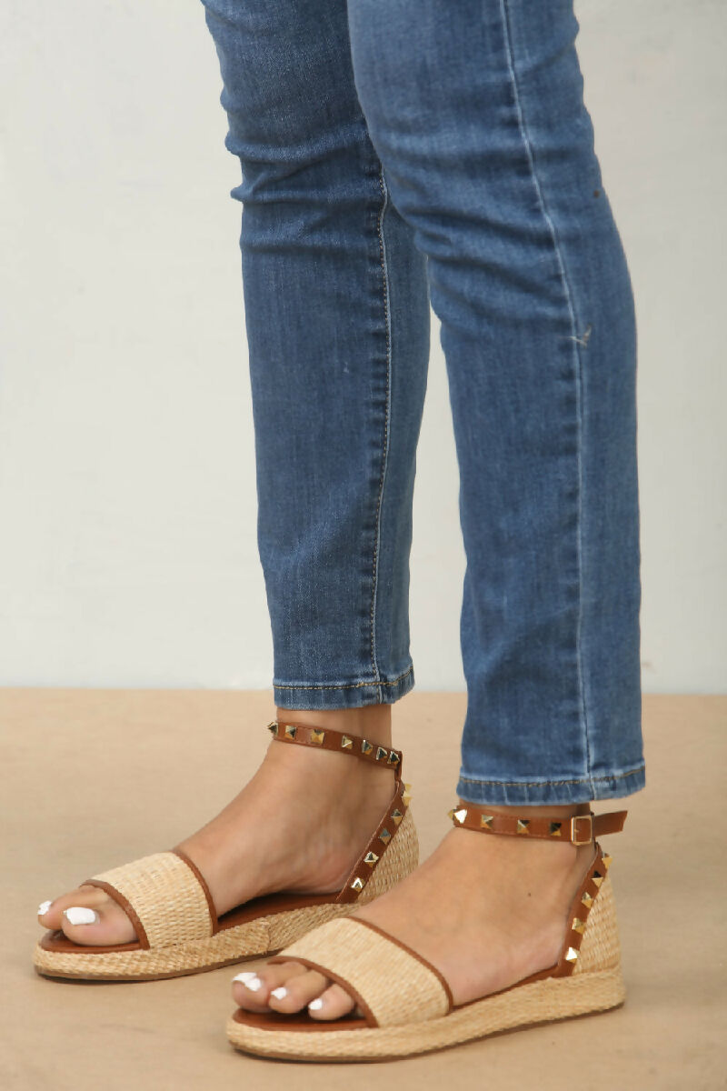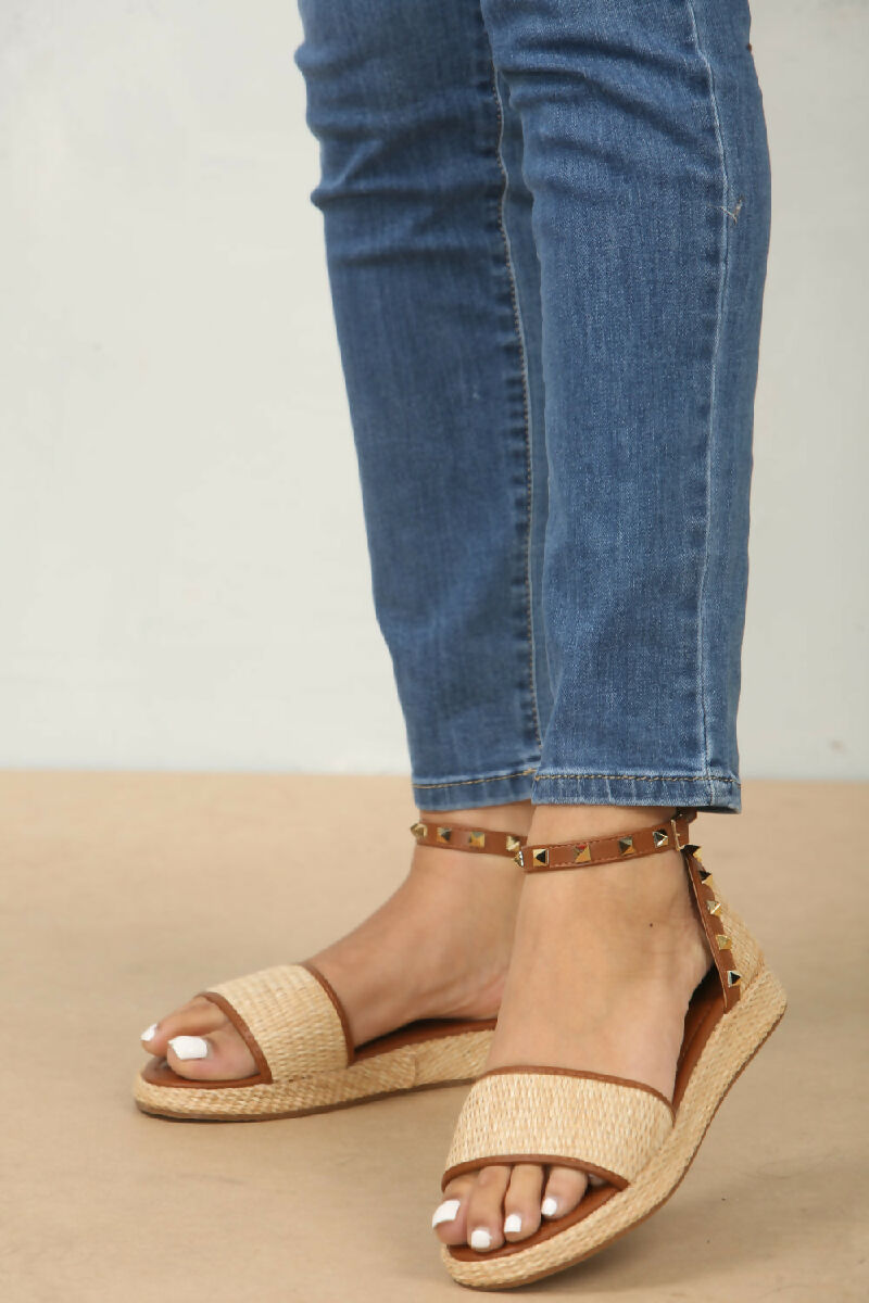 STUDDED RAFFIA CLOSED BACK ANKLE STRAP SANDALS IN TAN (PACK OF 12 PAIRS UK3-UK8)