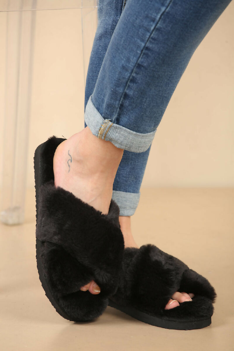 Black Cross Strap Faux Fur Slippers (PACK OF 12 PAIRS UK3-UK8)