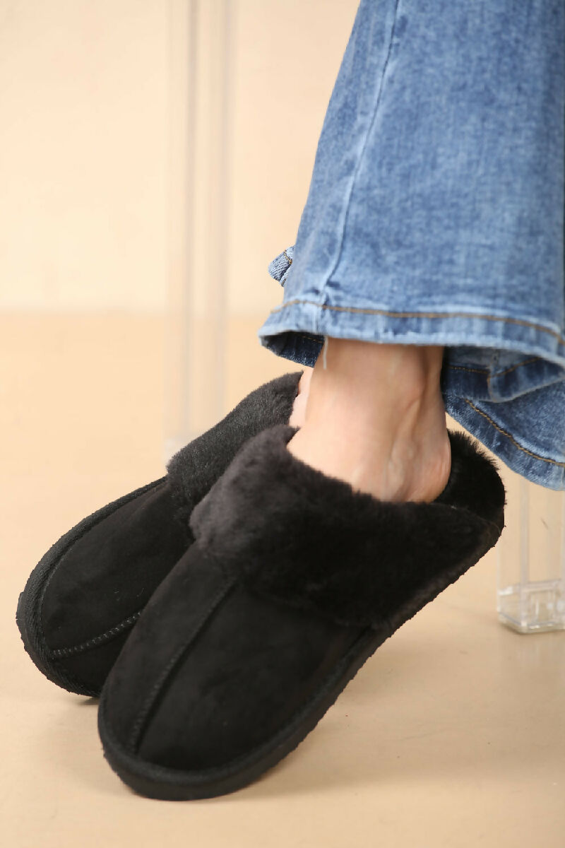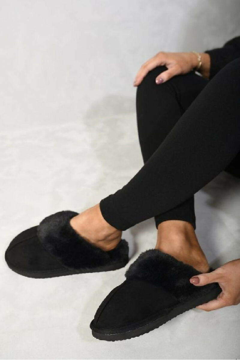Black Faux Fur Lined Slip-on Slippers (PACK OF 12 PAIRS UK3-UK8)