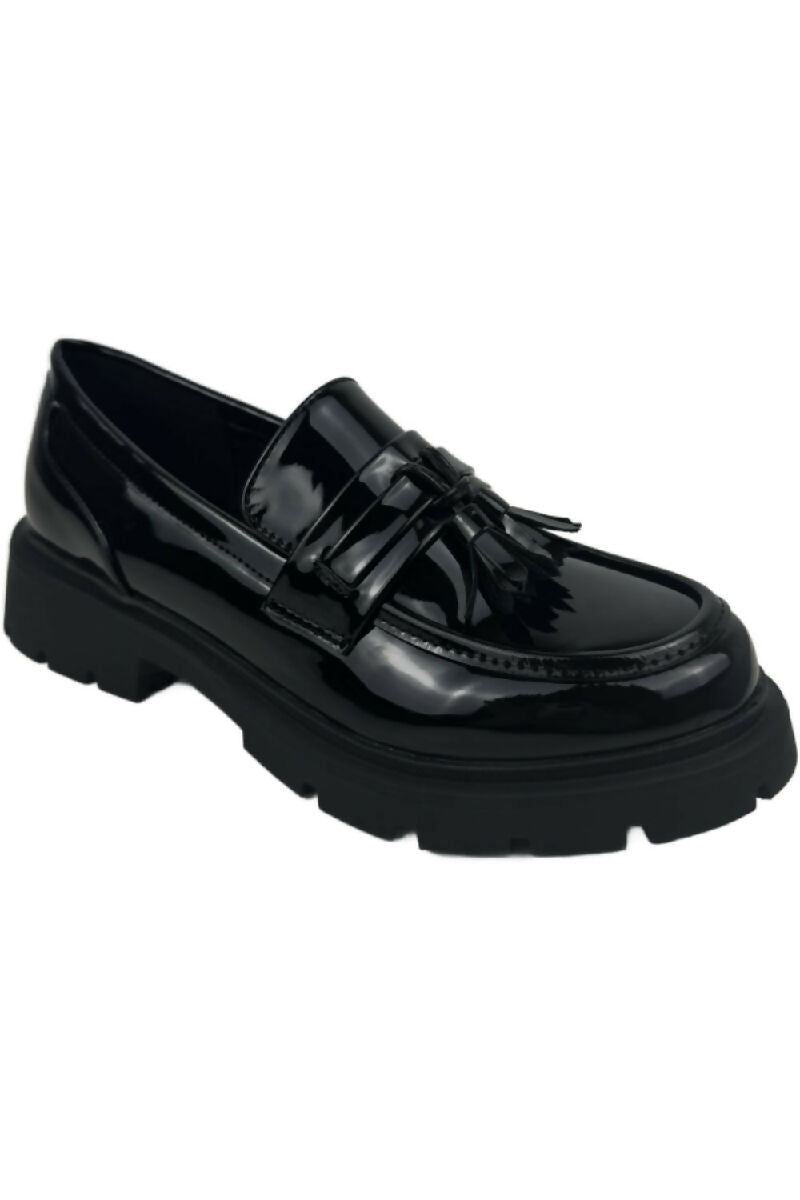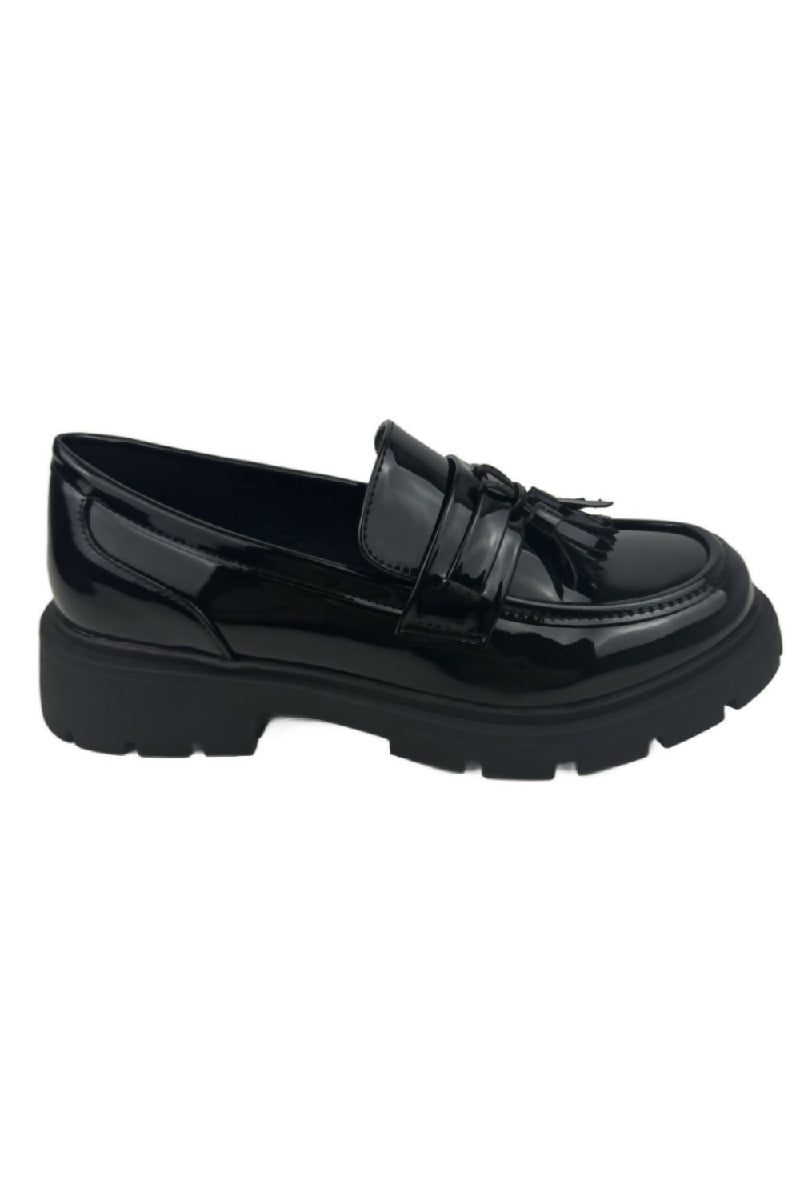 Black Patent Slip On Chunky Flatform Loafer Shoes With Tassle (PACK OF 12 PAIRS UK3-UK8)