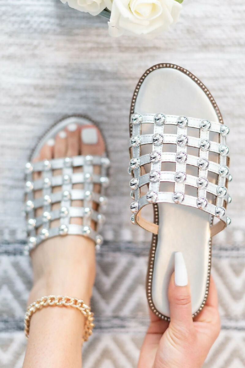 Women’s flat studded sandals with cut out cage strap finished with silver stud detailing.