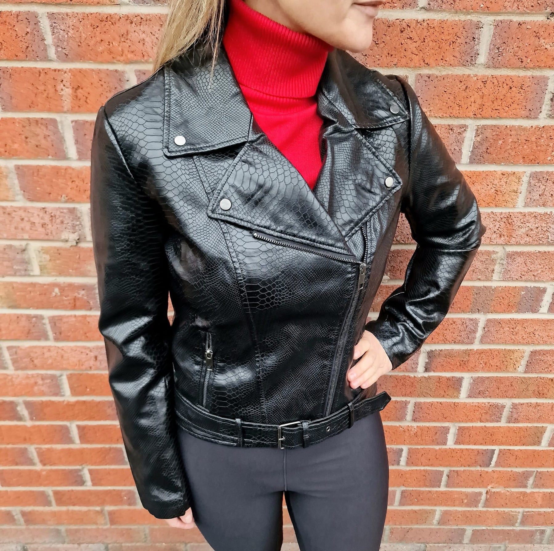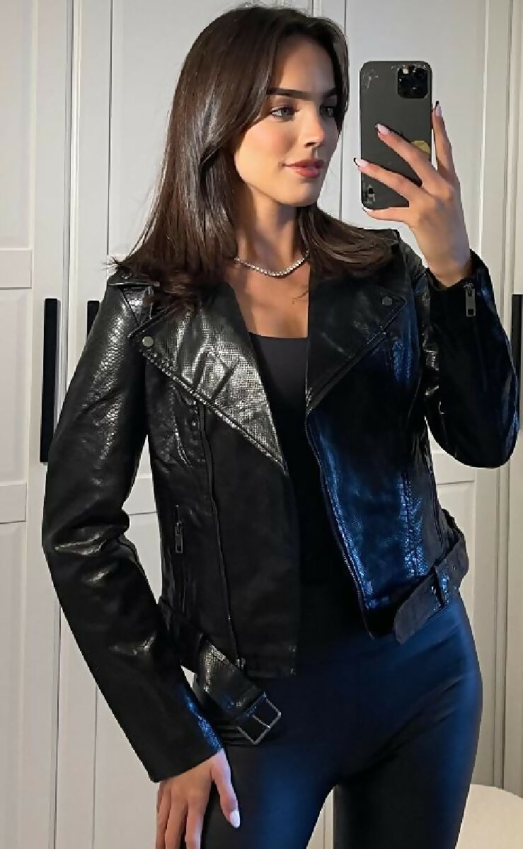Elevate your collection with this Black Biker Moc Croc Leather Look Jacket, a stylish and unique piece crafted from vegan leather with a striking moc croc texture. Combining sleek design with comfort, this jacket is a must-have for your customers seeking modern and edgy outerwear.